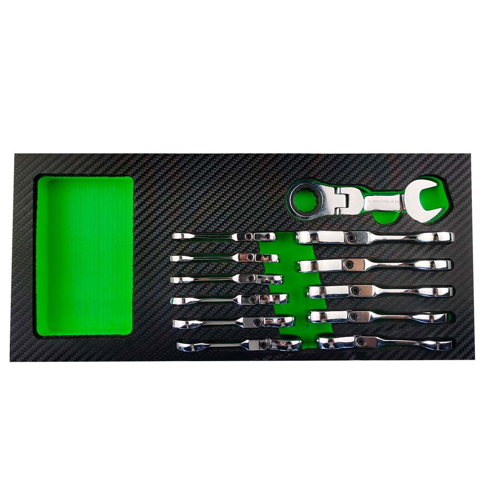Conjunto de chaves combinadas em suporte preto com textura carbono e interior verde