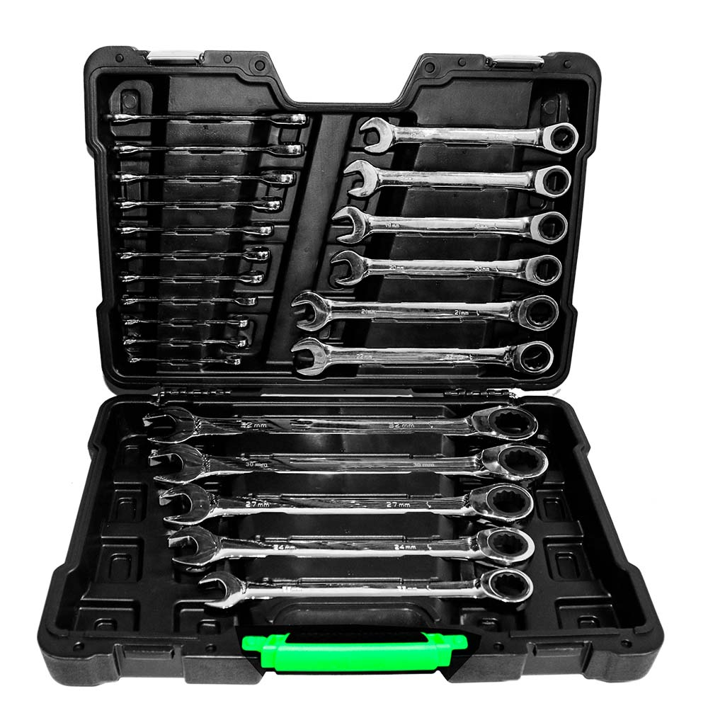 Conjunto de chaves de boca e de anel em caixa preta com pega verde