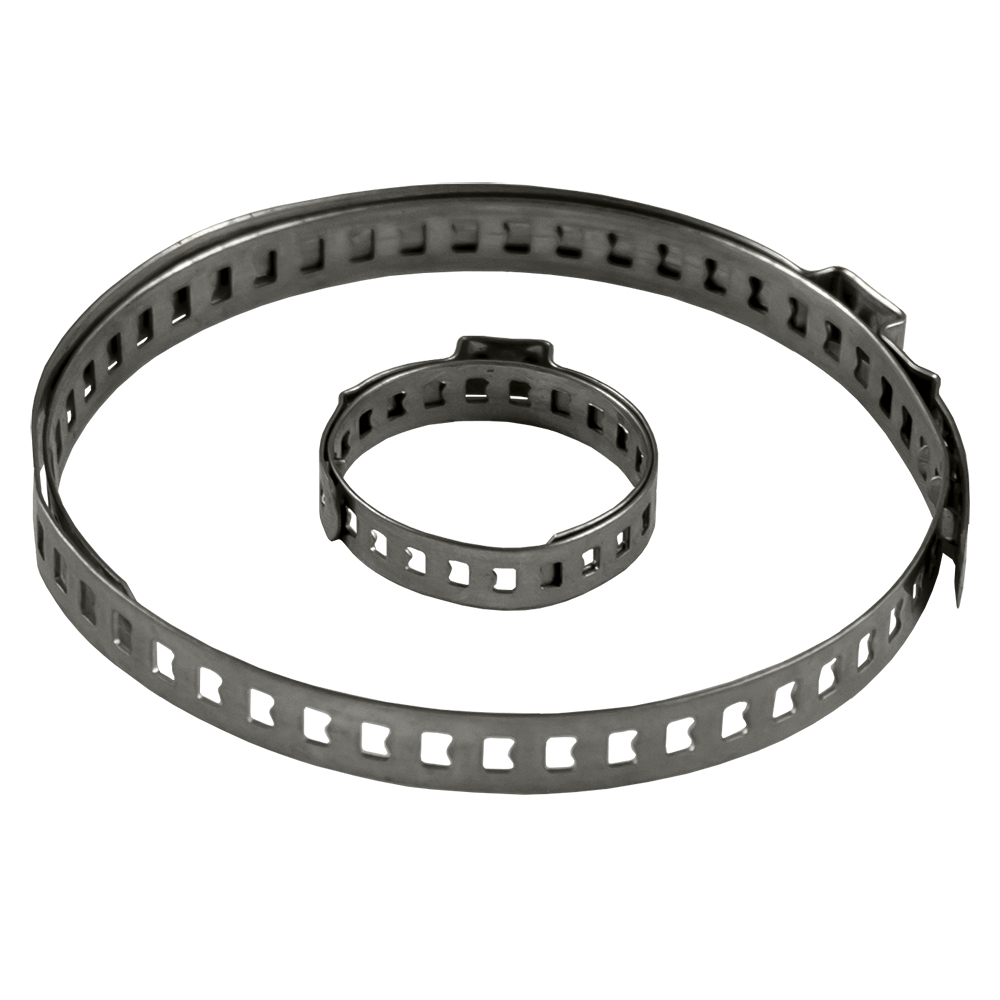Duas braçadeiras metálicas cinzentas com orifícios quadrados e fechos, em fundo branco