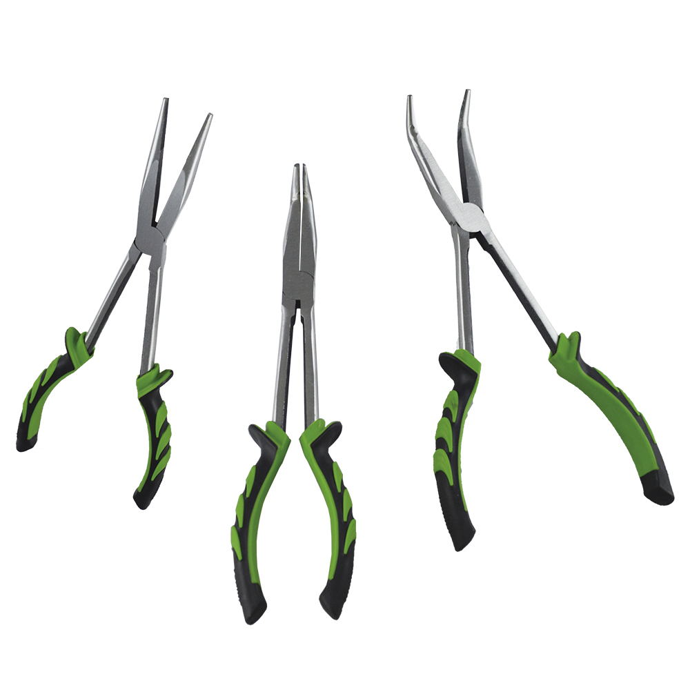 Três alicates com punhos verdes e pretos e extremidades metálicas