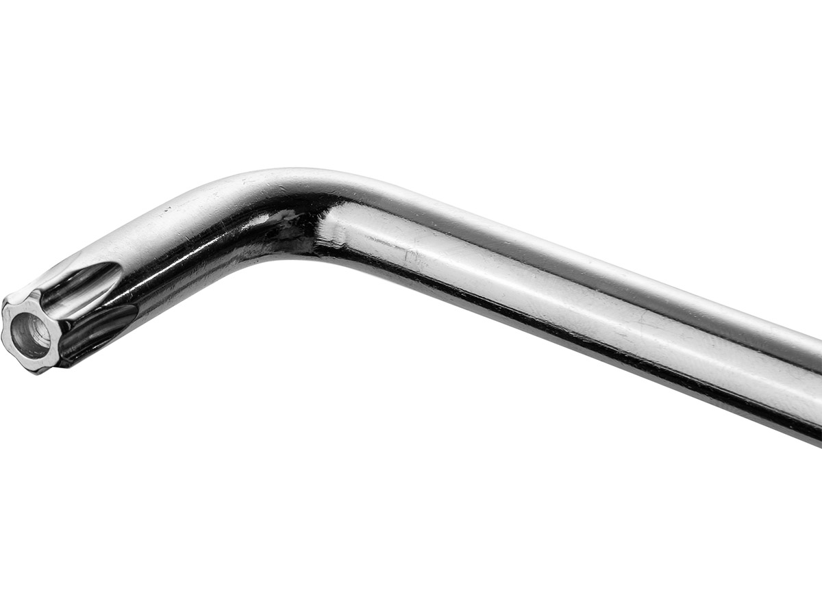 Conjunto de 9 chaves TORX L de ponta dupla com furo, tamanhos T10 a T50. Produto de alta qualidade, feito de aço cromo-vanádio (CR-V), o cromo utilizado garante ao aço resistência à corrosão, oxidação, abrasão e alta durabilidade em altas temperaturas, e a adição de vanádio também afeta a resistência a altas temperaturas e não deformando. O conjunto é colocado em um estojo prático com furo para pendurar no gancho, por exemplo, em uma oficina, o que facilita o armazenamento e o transporte devido ao espaço dedicado para cada chave.