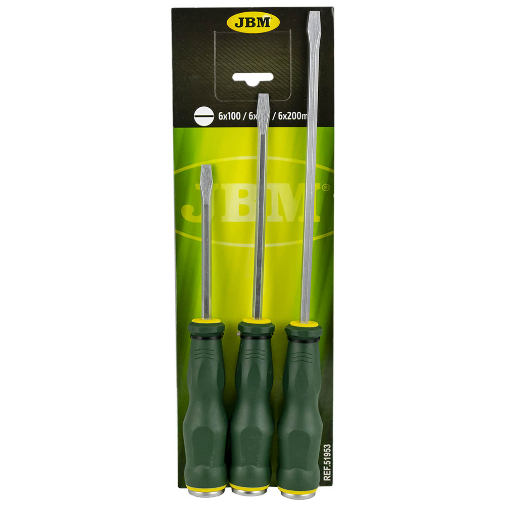 Conjunto de três chaves de fendas JBM com cabos verdes e detalhes amarelos