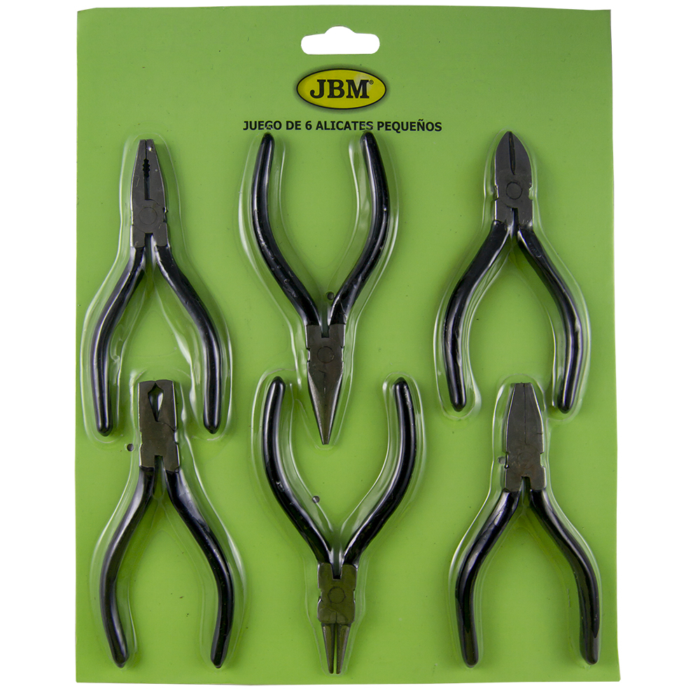 Conjunto de 6 alicates pequenos em cartão verde com texto JBM