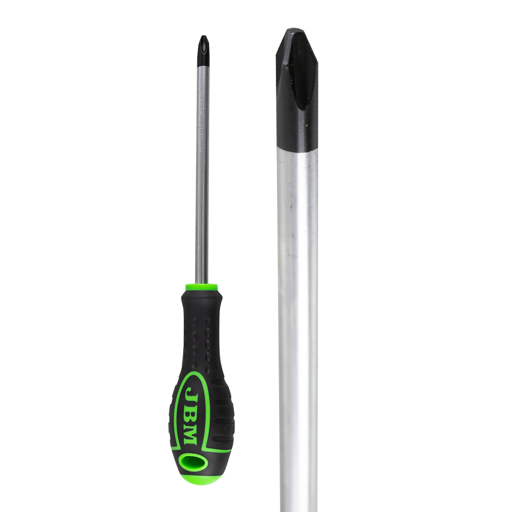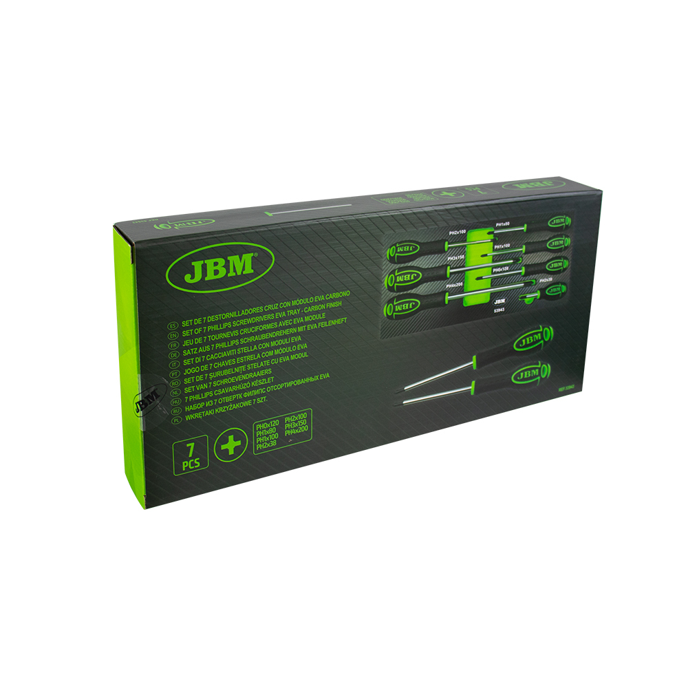 Conjunto de chaves de fendas pretas e verdes da marca JBM em fundo preto com almofada verde