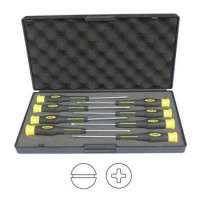 Conjunto de 8 chaves de fendas com cabos pretos e amarelos numa caixa cinzenta aberta.