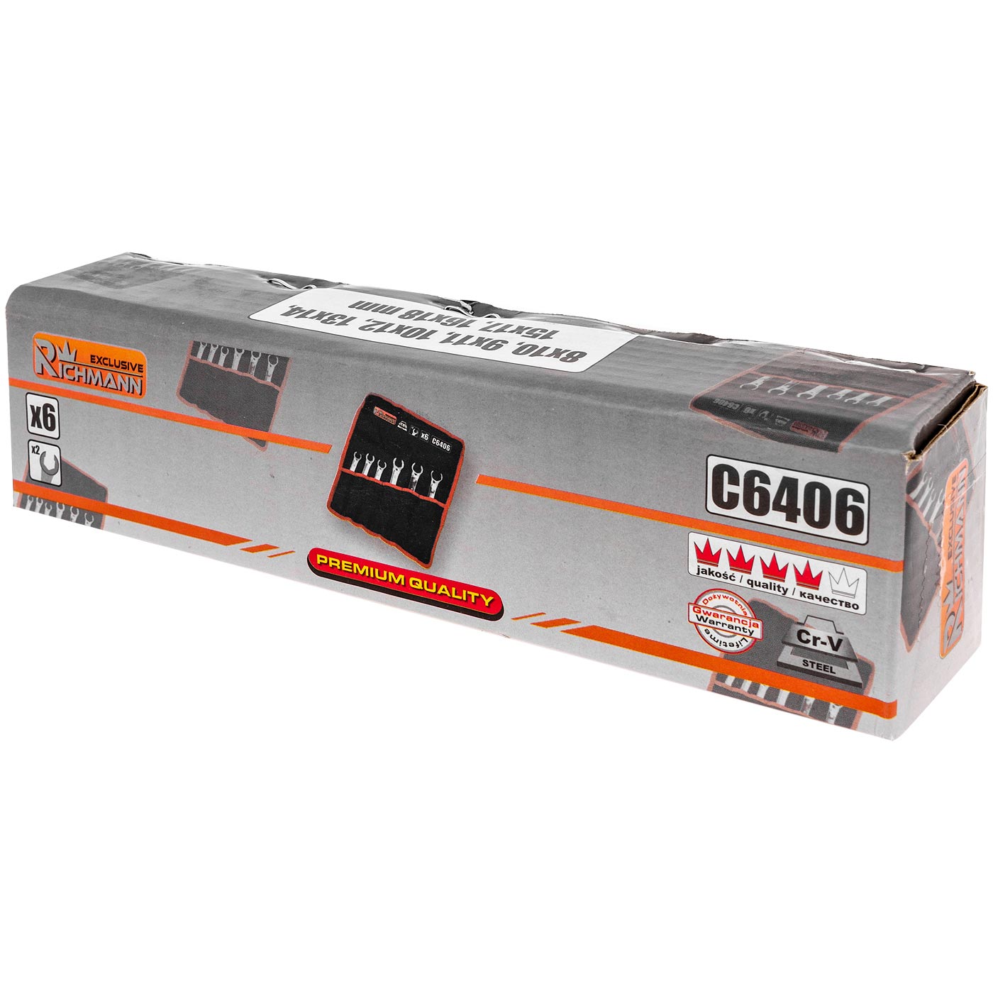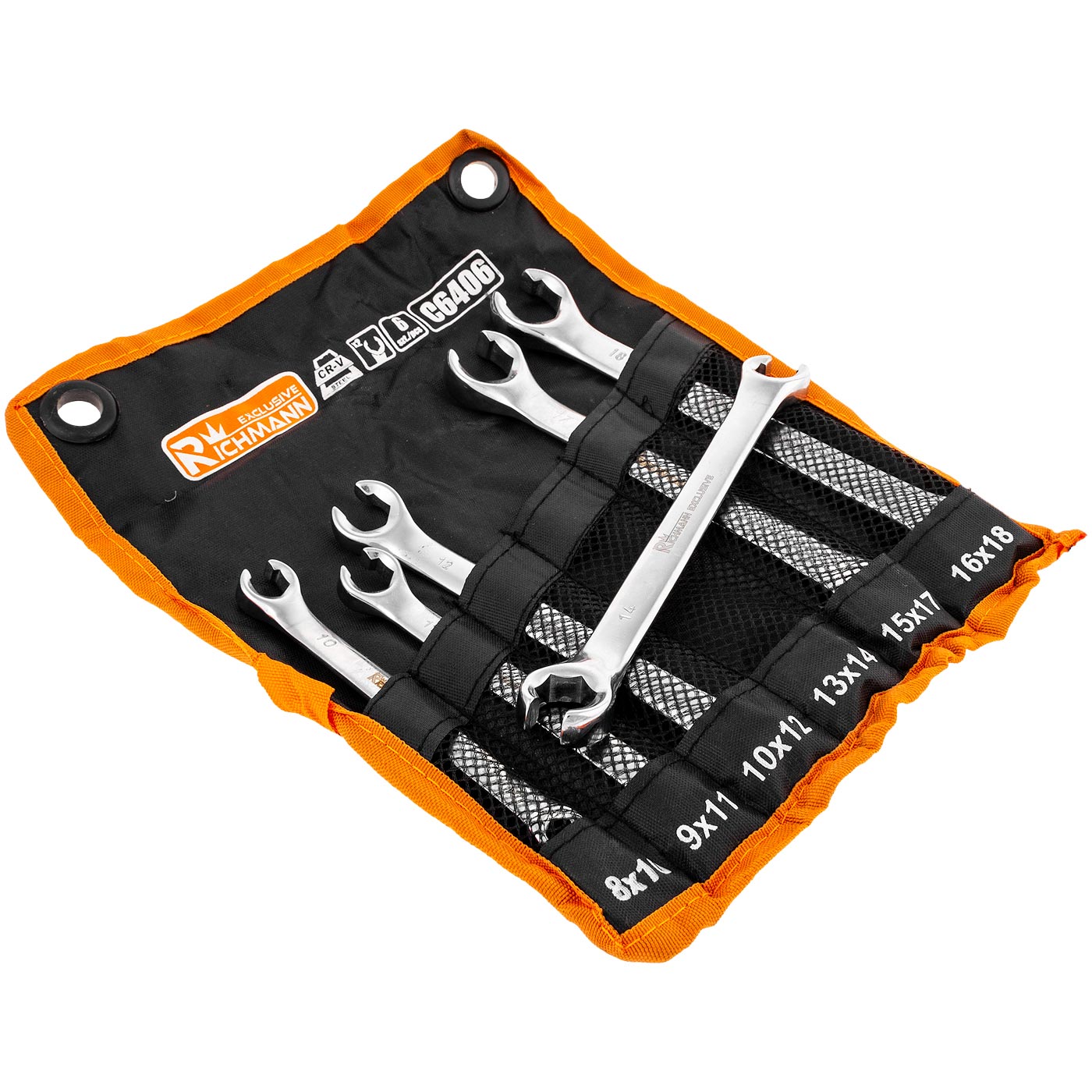 Conjunto de 6 chaves semi-abertas para linhas de freio. Frente e verso, cromado na faixa de tamanho de 8-18 mm. O conjunto é colocado em uma folha enrolada, amarrada com listras, para facilitar o armazenamento e o transporte. Fabricado em aço cromo-vanádio (CR-V), o cromo utilizado garante ao aço resistência à corrosão, oxidação, abrasão e alta durabilidade em altas temperaturas, e a adição de vanádio também afeta a resistência a altas temperaturas e não deforma. Marcação de tamanho permanente e visível em cada chave. A folha está equipada com ilhós para pendurar em um gancho, por exemplo, em uma oficina. O conjunto inclui todas as chaves com um bolso de malha atribuído. Qualidade premium. Garantia de vida.