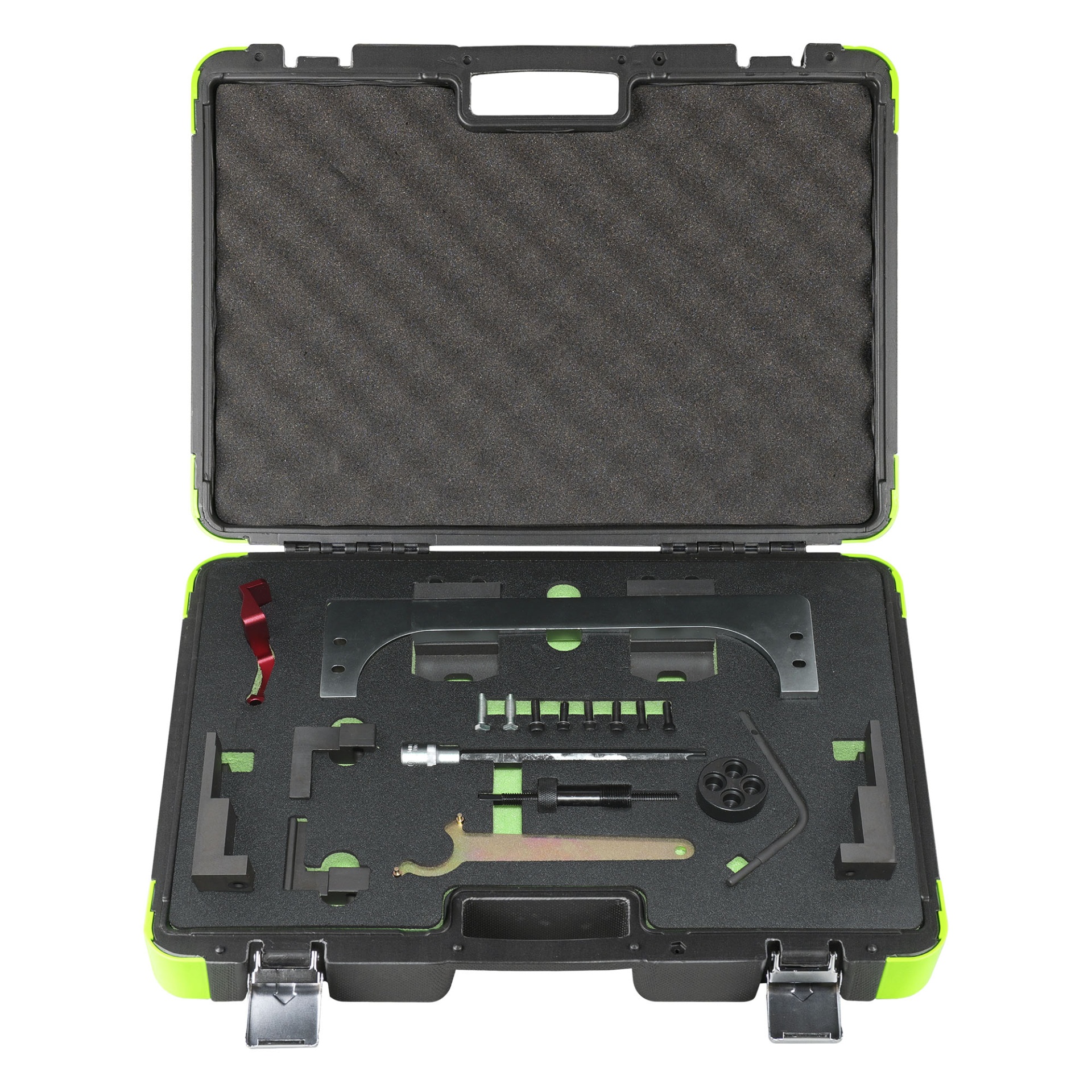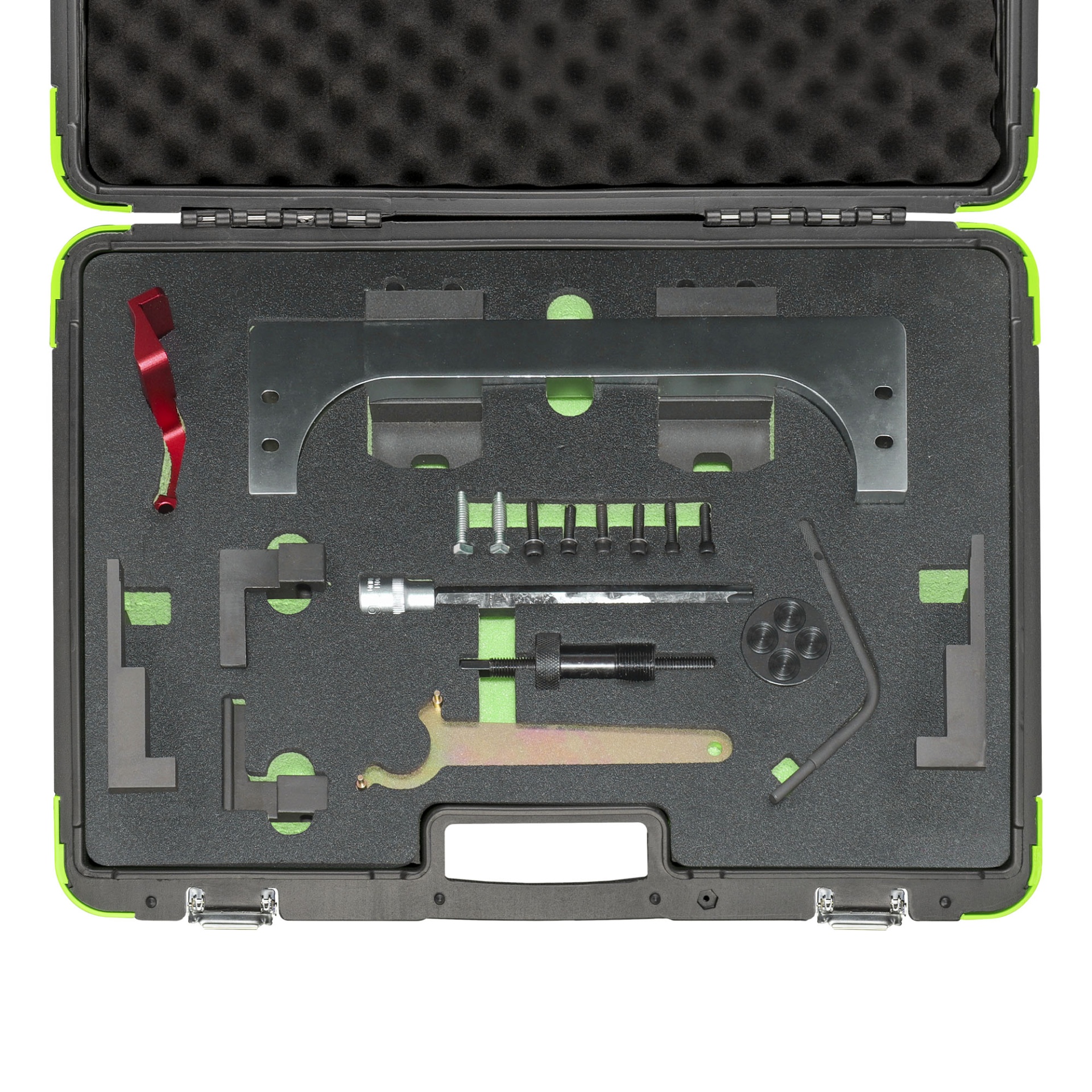 Mala de transporte preta e verde com acessórios e ferramentas organizados em espuma preta