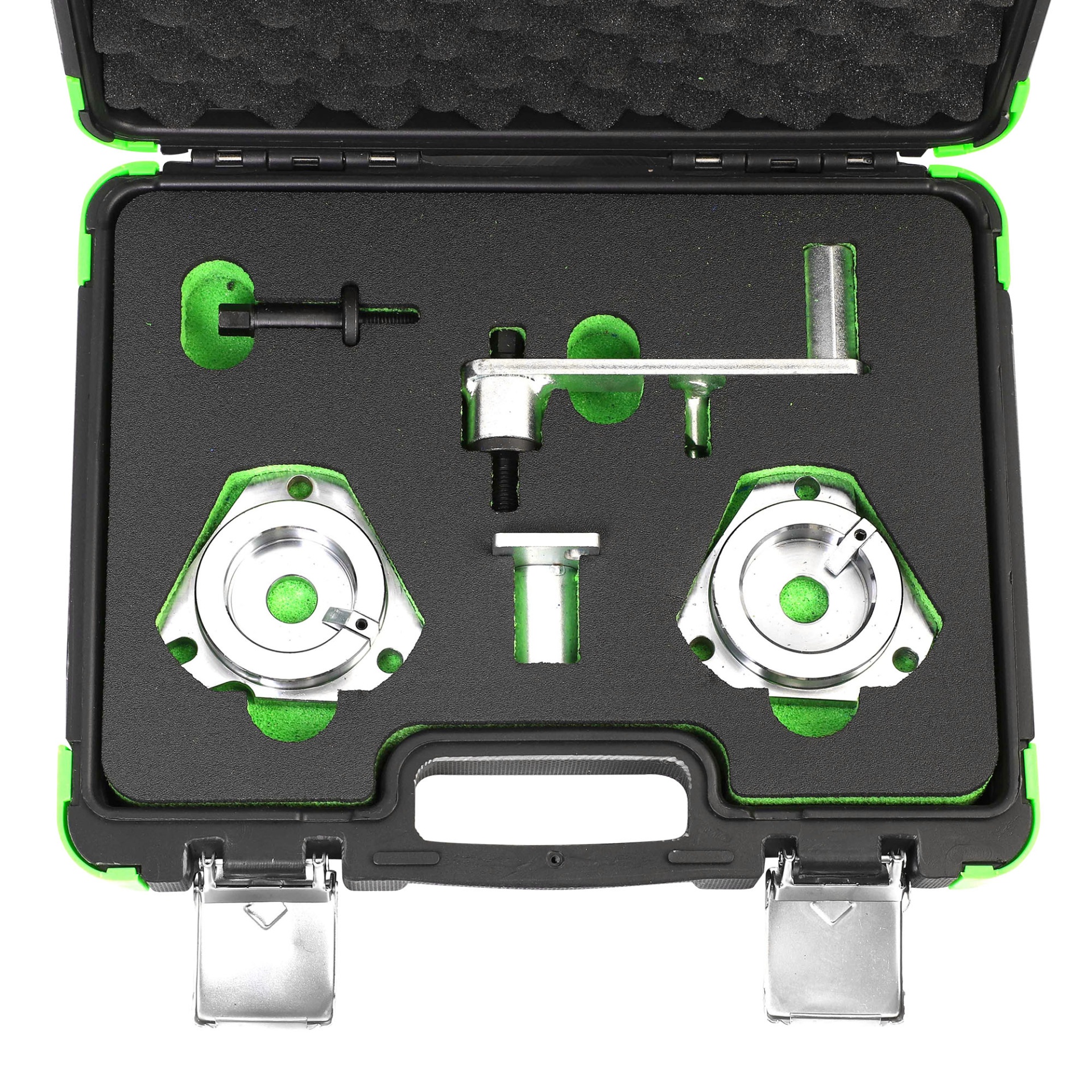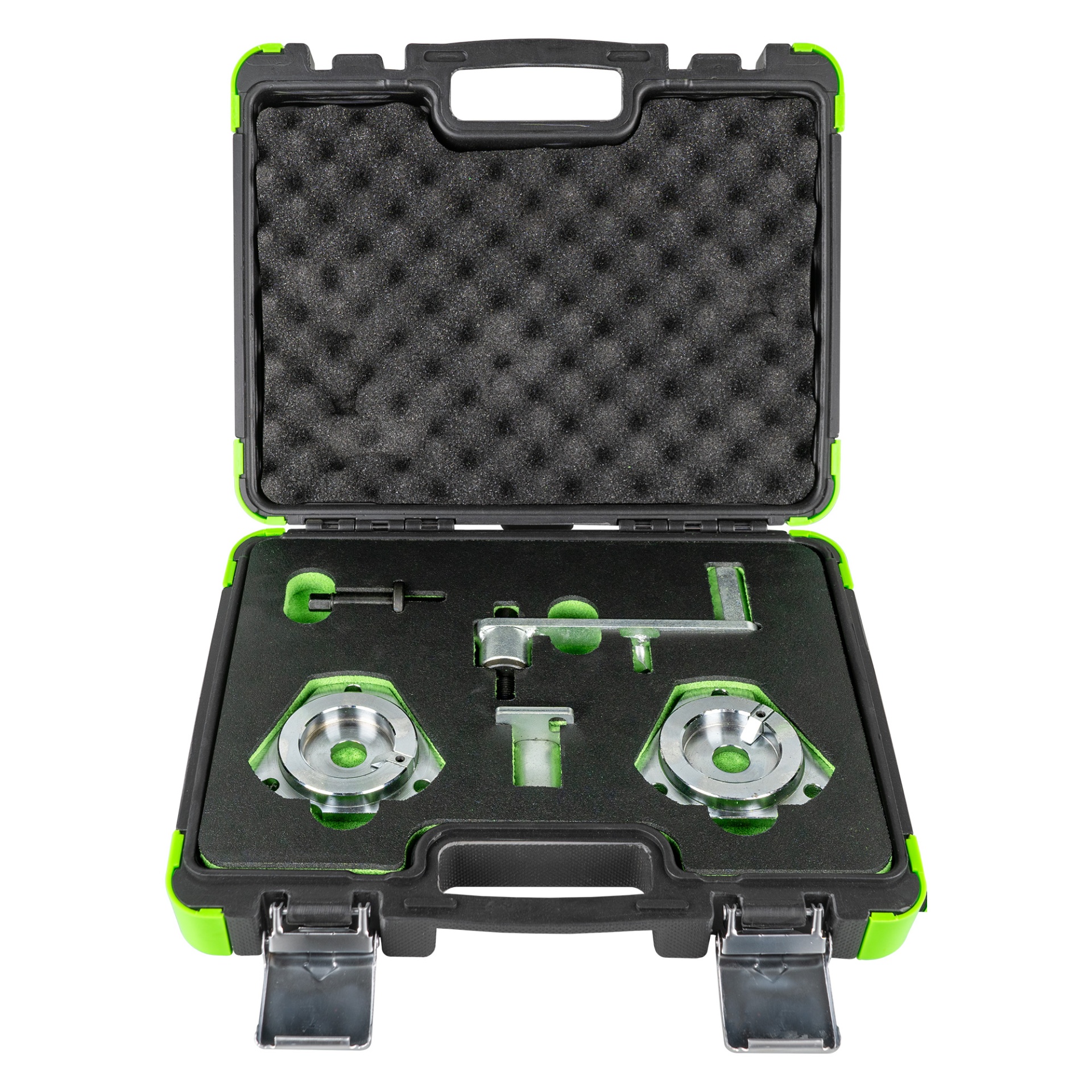 Conjunto de ferramentas metálicas em mala preta com espuma verde