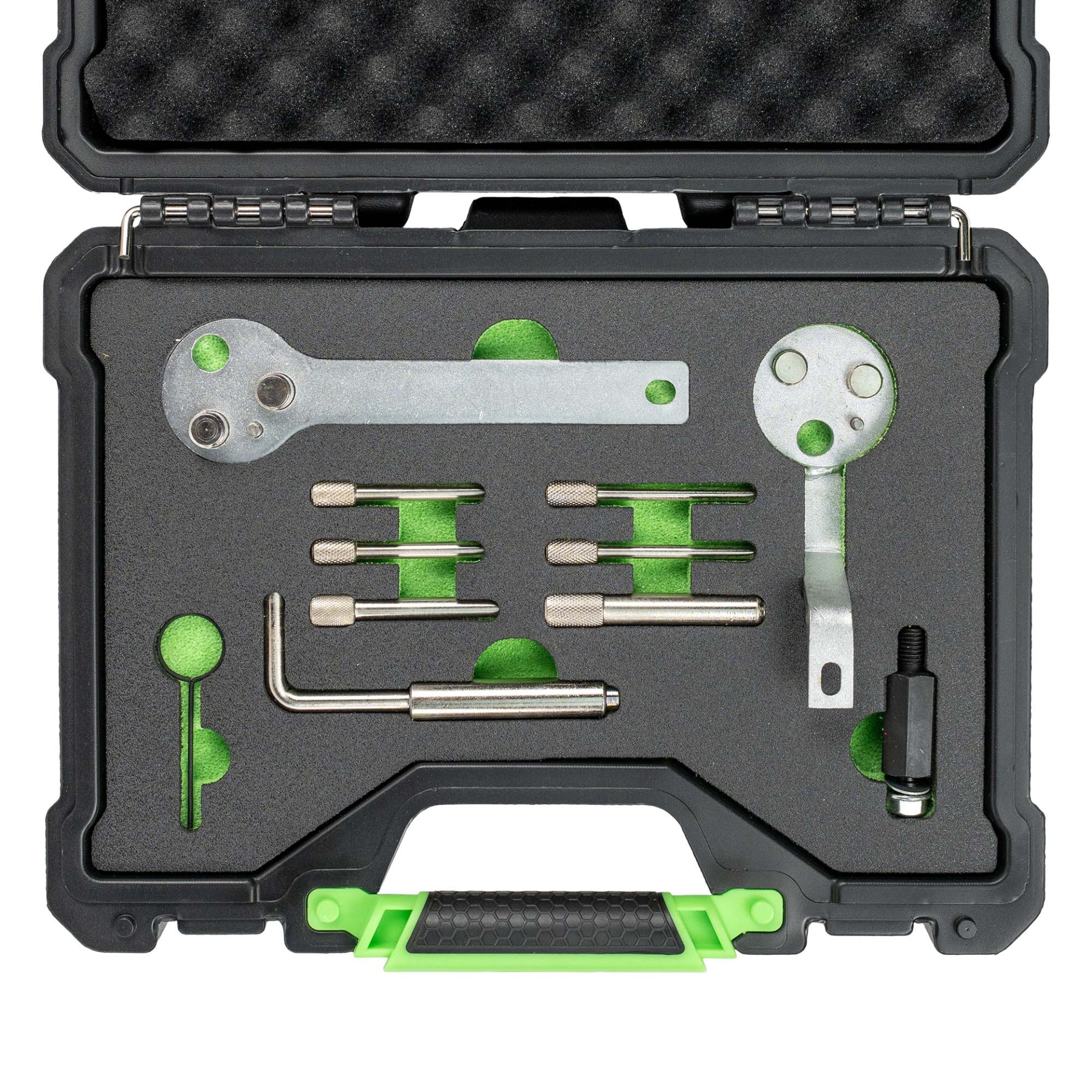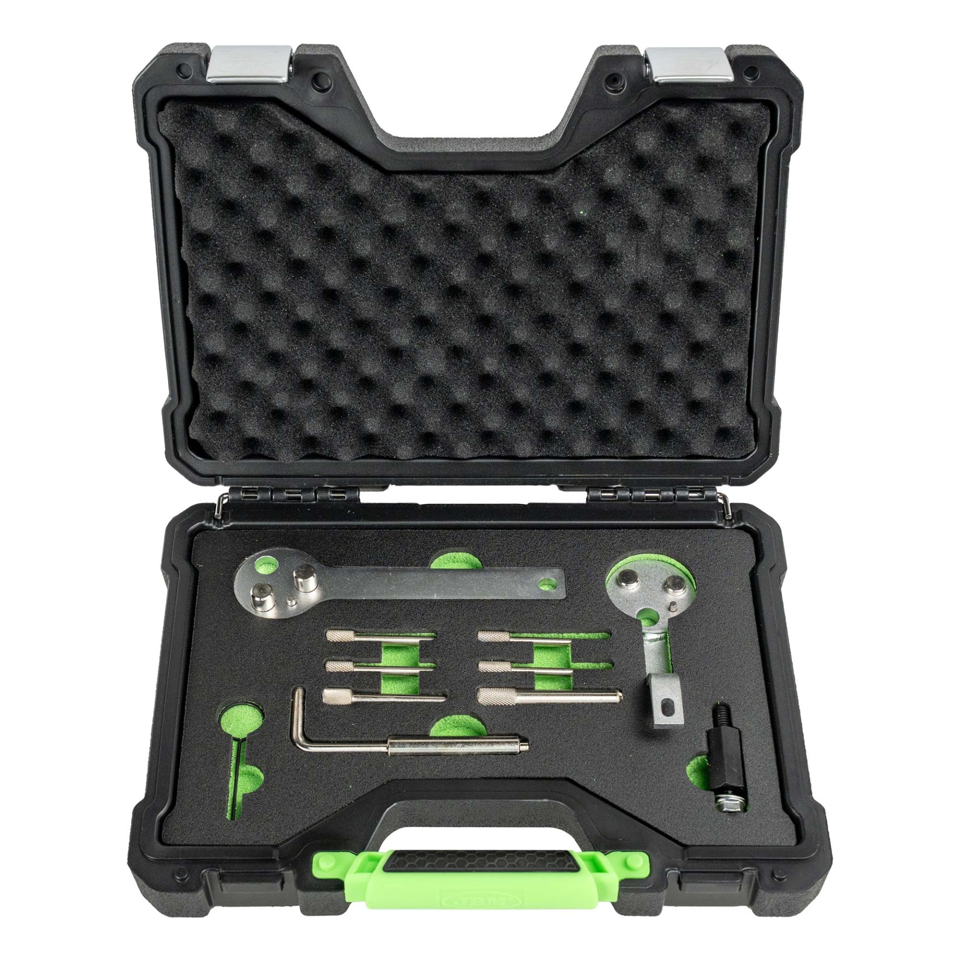 Conjunto de ferramentas metálicas em estojo preto com interior em espuma preta e verde.