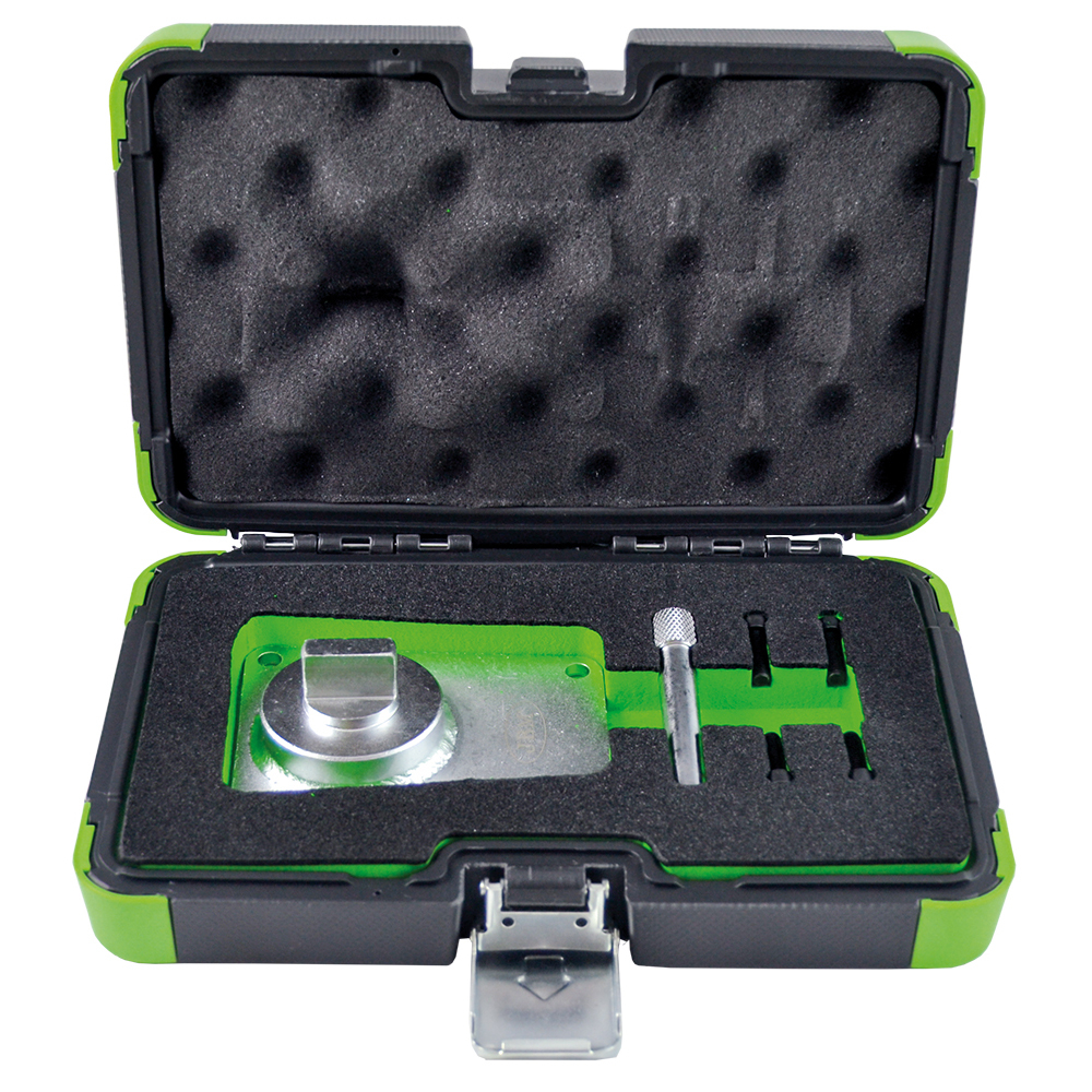 Conjunto de ferramentas num estojo preto com detalhes verdes e interior em espuma