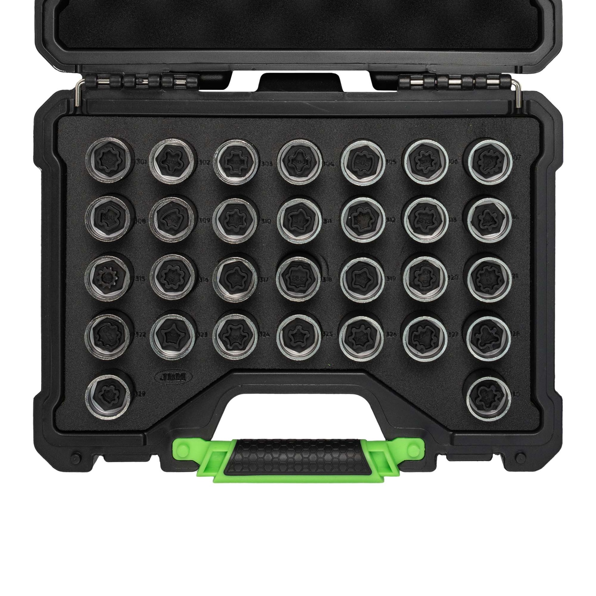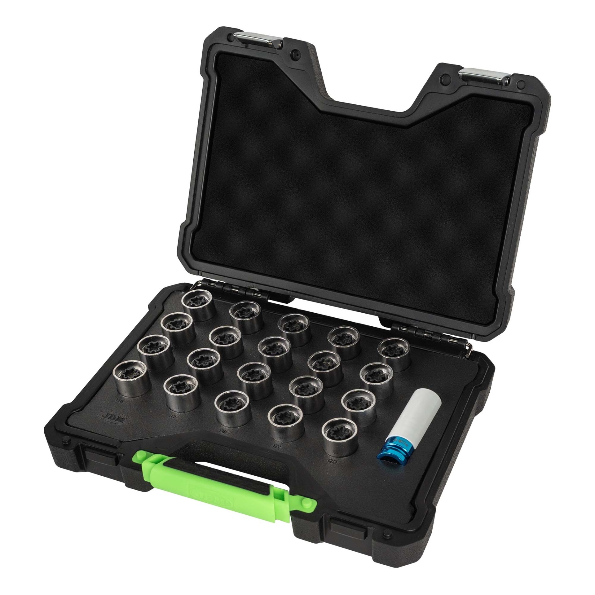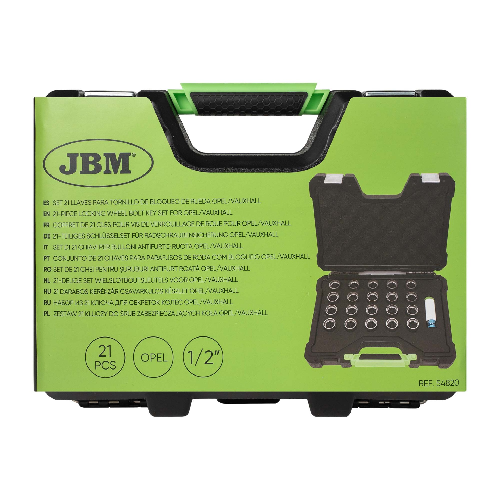 O JBM 54820 é um conjunto profissional de 21 peças, desenhado exclusivamente para os parafusos de bloqueio de roda da gama Opel e Vauxhall que utilizam o sistema de codificação 101 a 120. Este kit foi desenvolvido para oferecer um ajuste perfeito, eliminando o risco de danificar os pernos ou as jantes durante a manutenção. É a ferramenta indispensável para lidar com as variações de perfil que os kits universais não conseguem cobrir.