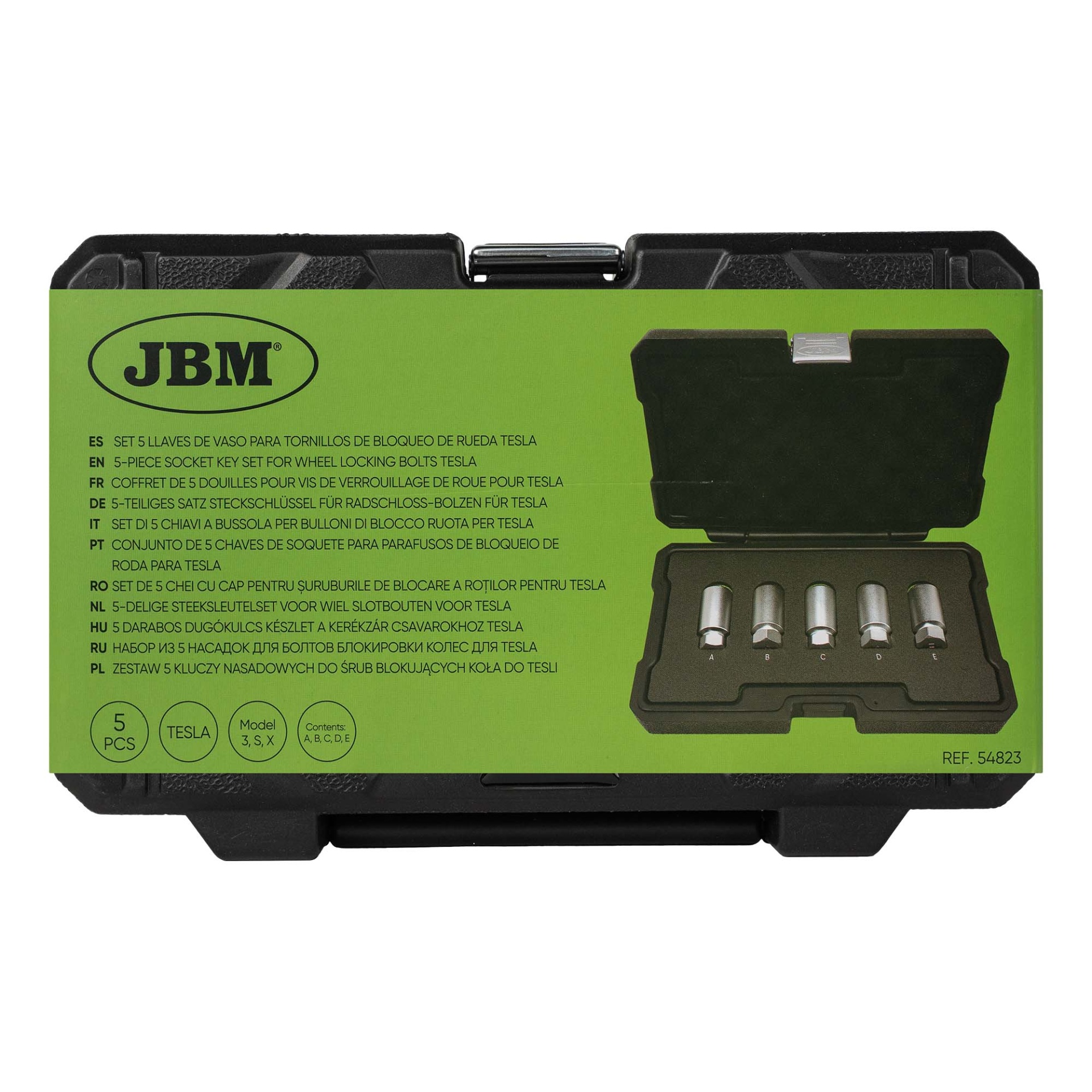 O JBM 54823 é um conjunto de chaves de caixa (soquetes) de alta precisão, especificamente desenvolvido para os parafusos de bloqueio de roda originais da Tesla. Numa marca onde a ausência de pneu suplente e de ferramentas de bordo é a norma, este kit torna-se obrigatório para qualquer oficina que realize serviços de pneus, travões ou suspensão em veículos Tesla, permitindo a remoção dos pernos anti-roubo sem danificar as jantes de liga leve.