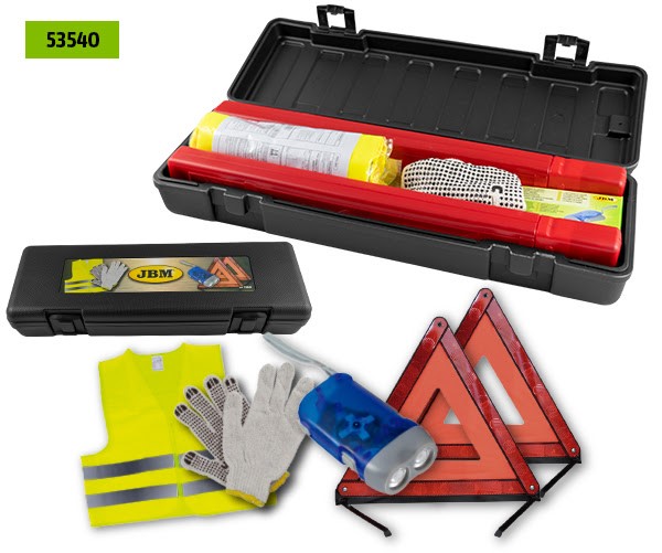 Conjunto de segurança automóvel com colete, luvas, triângulos de emergência, lanterna e caixa preta