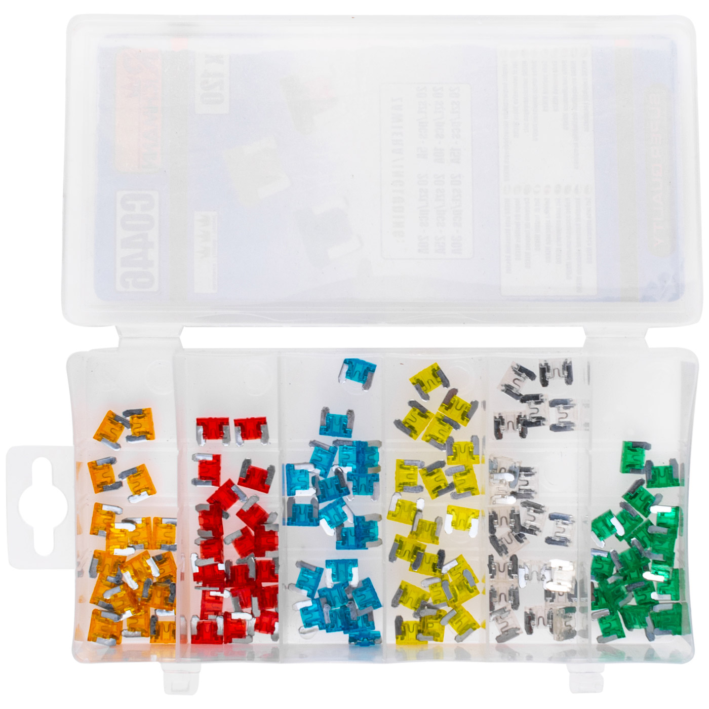 O conjunto inclui fusíveis MINI com diferentes níveis de amperagem.