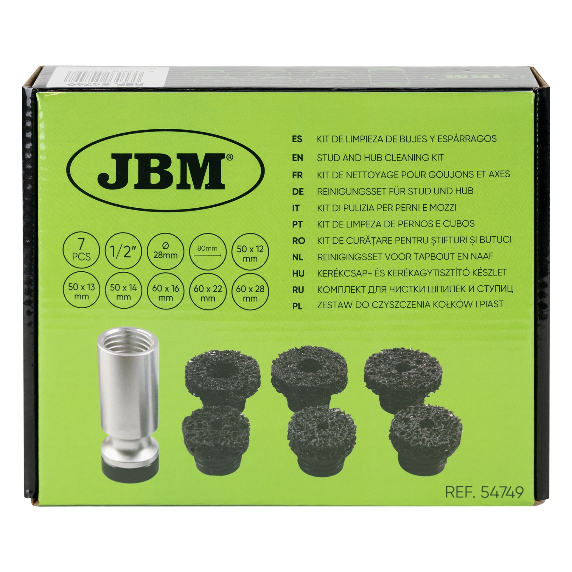 JBM 54749 é um conjunto de limpeza profissional desenhado para remover rapidamente a ferrugem, a corrosão e a sujidade acumulada nos pernos e nos cubos de roda. Superfícies de contacto sujas podem causar leituras falsas de binário (torque) e vibrações indesejadas na direção. Este kit permite preparar as superfícies de assentamento em segundos, garantindo uma união perfeita entre o disco, o cubo e a jante.