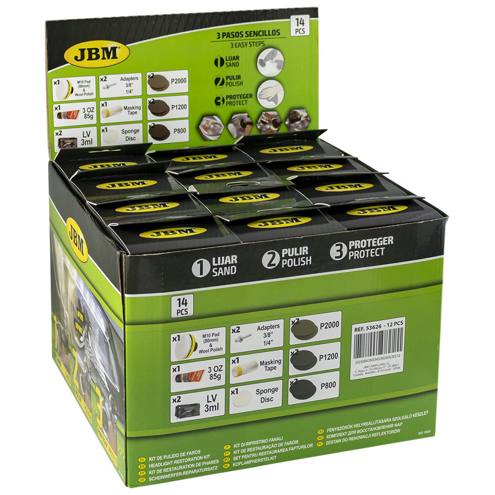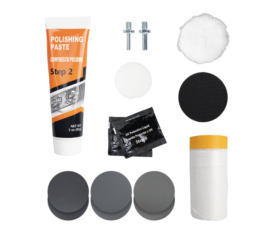 2 x Disco de lixa P800 2x Disco de lixa P1200 2x Disco de lixa P2000 1 x 85g Pasta de polimento 2 x 3,0 ml de líquido de proteção UV 1 x fita adesiva 1 x fita adesiva 1 x disco de polimento de lã 1x disco de esponja branco 1x Rosca M10 da almofada de suporte 2x Adaptador (3/8 ”e 1/4”)