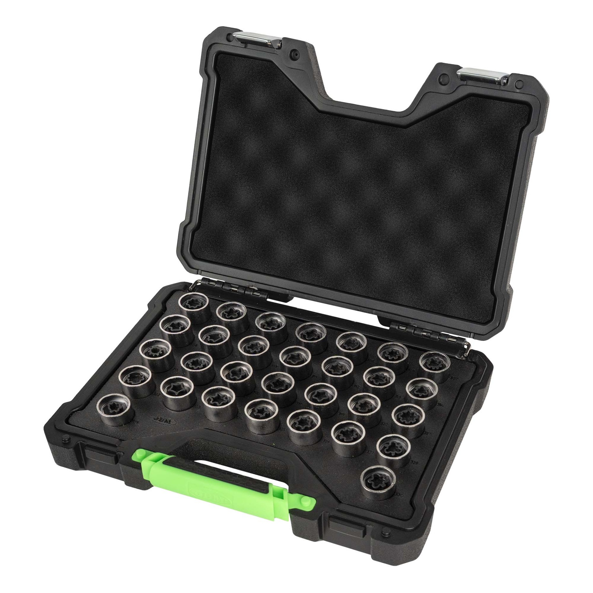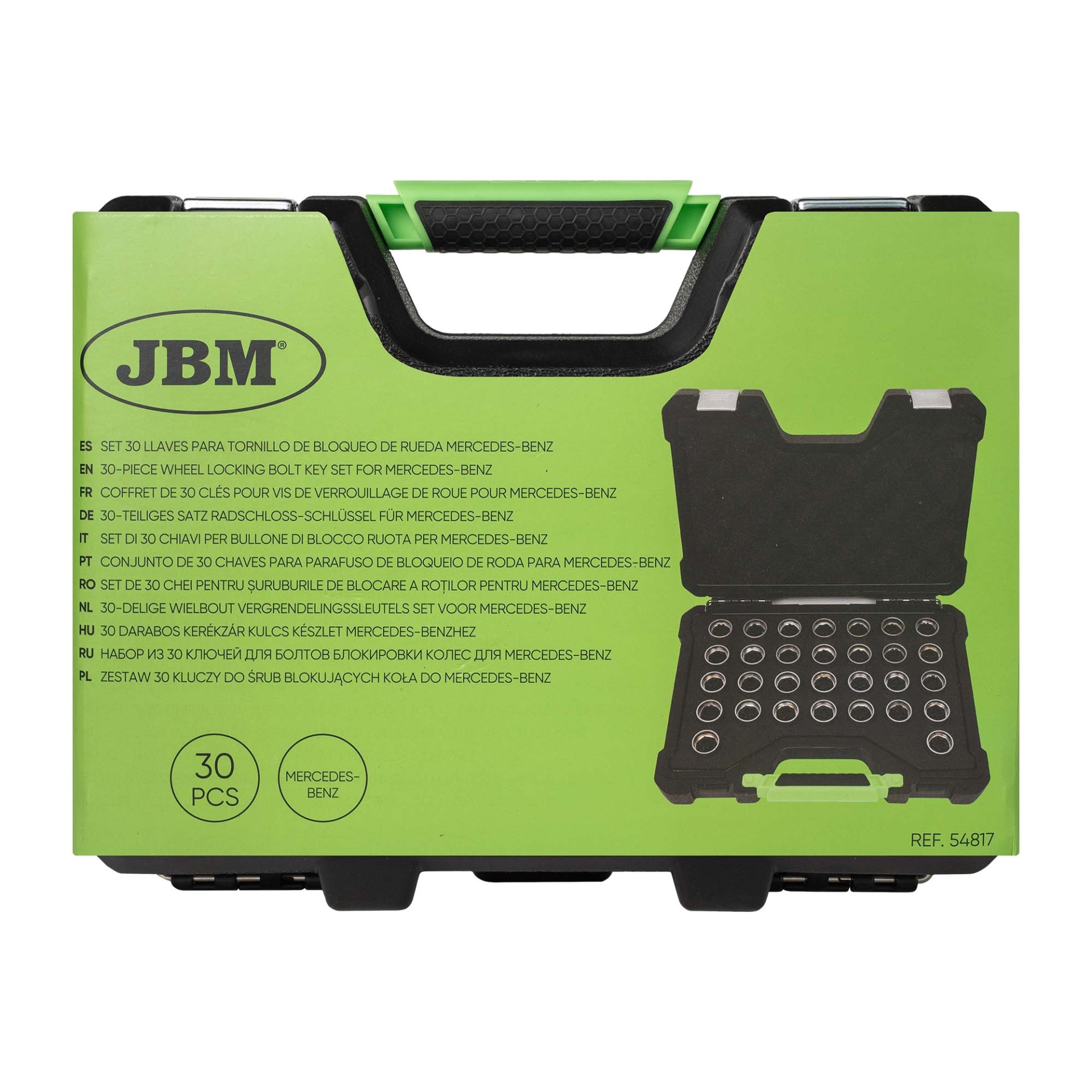 O JBM 54817 é o conjunto mais completo do mercado para a gestão de parafusos de bloqueio de roda originais da Mercedes-Benz. Com 30 adaptadores de precisão, este kit cobre praticamente todos os perfis utilizados pela marca, incluindo os padrões clássicos e as geometrias mais recentes e complexas. É uma ferramenta estratégica para oficinas que não podem permitir atrasos na entrega de veículos premium devido a chaves de segurança perdidas ou danificadas.