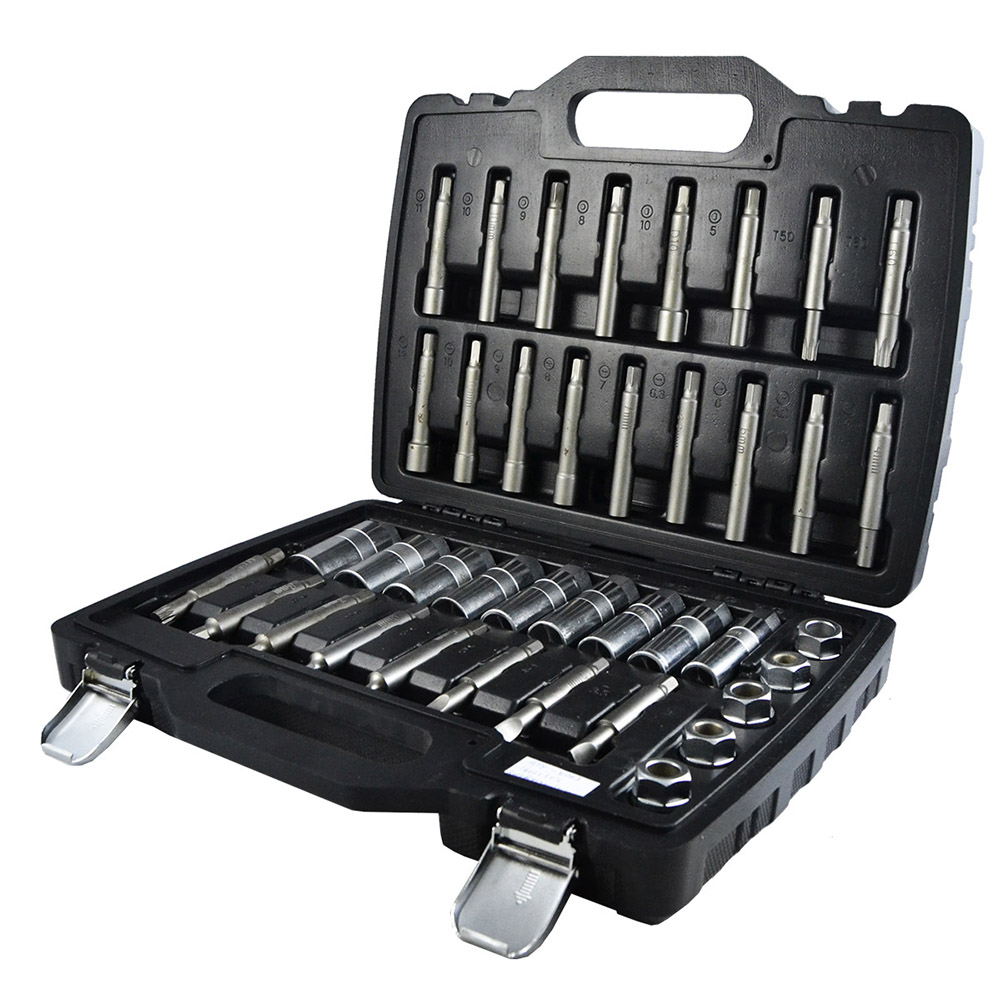 Conjunto de ferramentas em estojo preto com pontas e soquetes metálicos organizados
