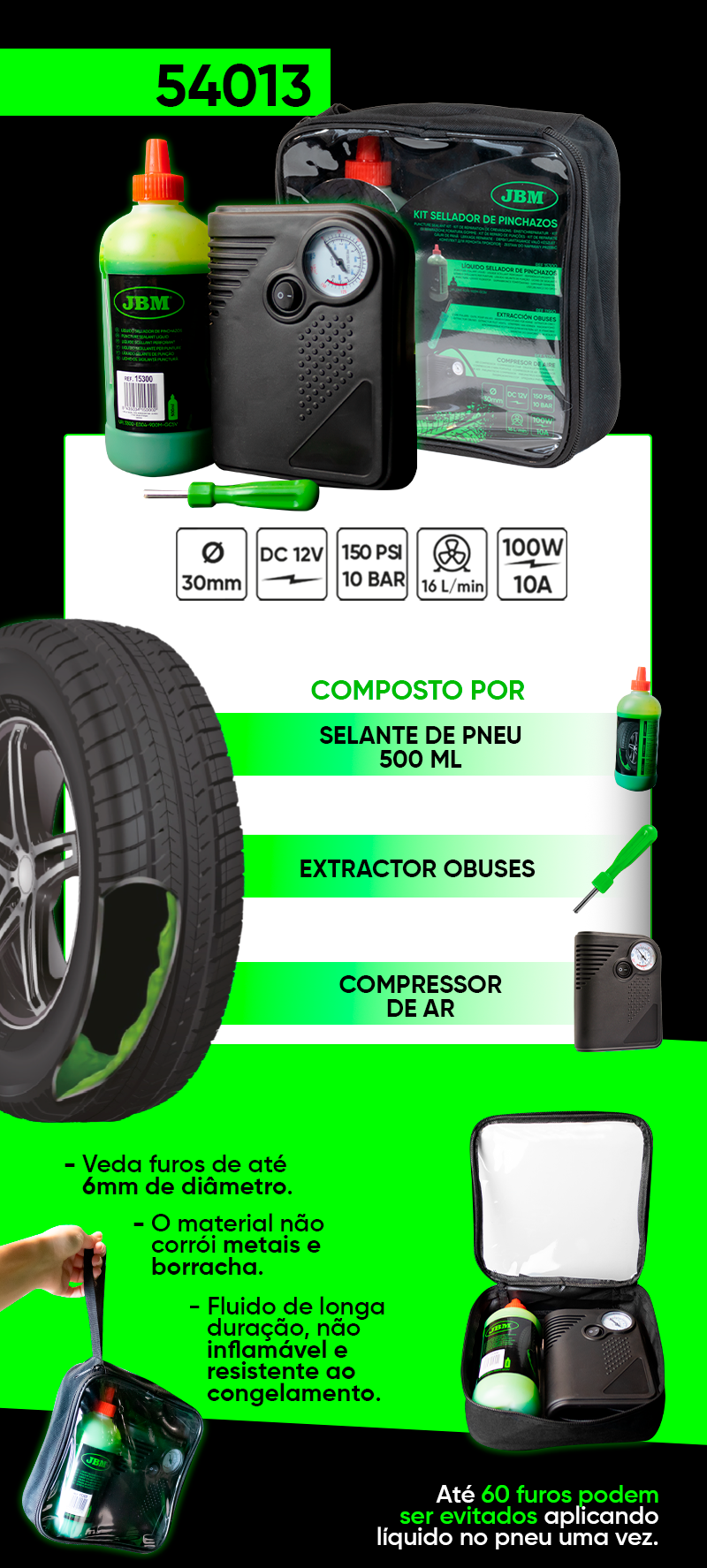 Vantagens ✓ Fácil de transportar, apresentado em bolsa para roupa de 21x21x7cm ✓ Produto multiusos para qualquer tipo de pneu (bicicleta, motociclo, automóvel, camião, etc.) ✓ Não danifica o sistema de monitorização da pressão dos pneus (TPMS)