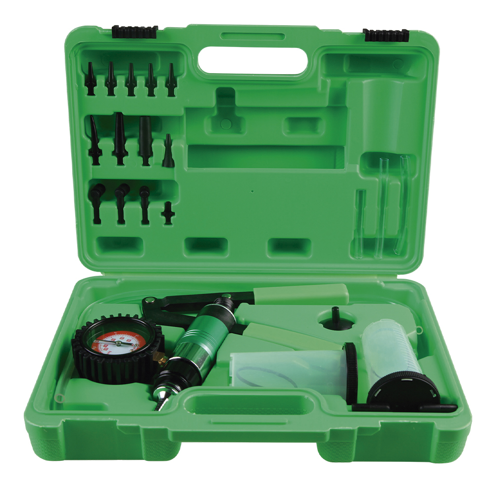 Kit de medidores para travões com bomba de vácuo em caixa verde aberta