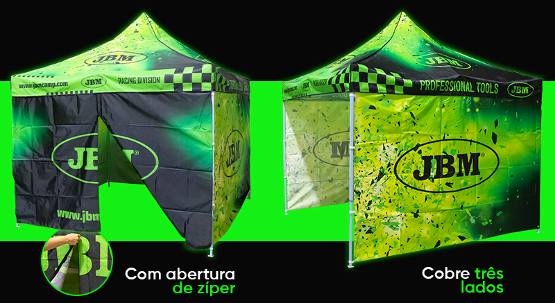 Tenda dobrável com cobertura e laterais personalizadas, em verde e preto.