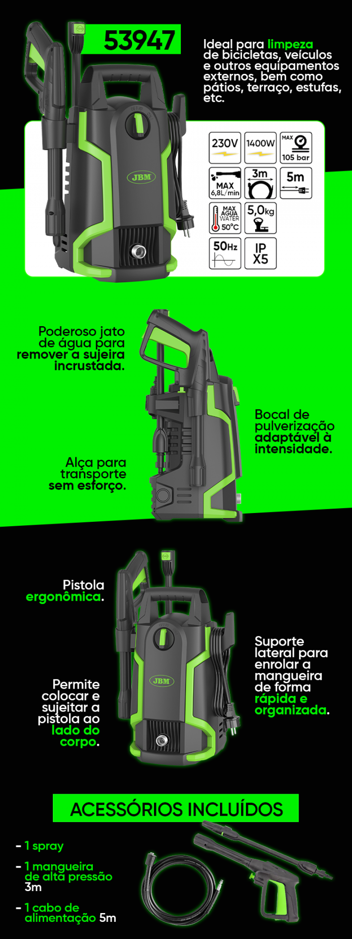 Máquina de lavar a pressão elétrica preta com detalhes verdes e cinzentos, mostrando acessórios e especificações técnicas