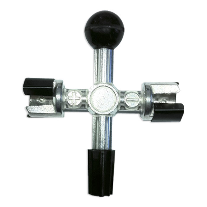 Ferramenta metálica em cruz com pontas pretas de plástico e fundo branco