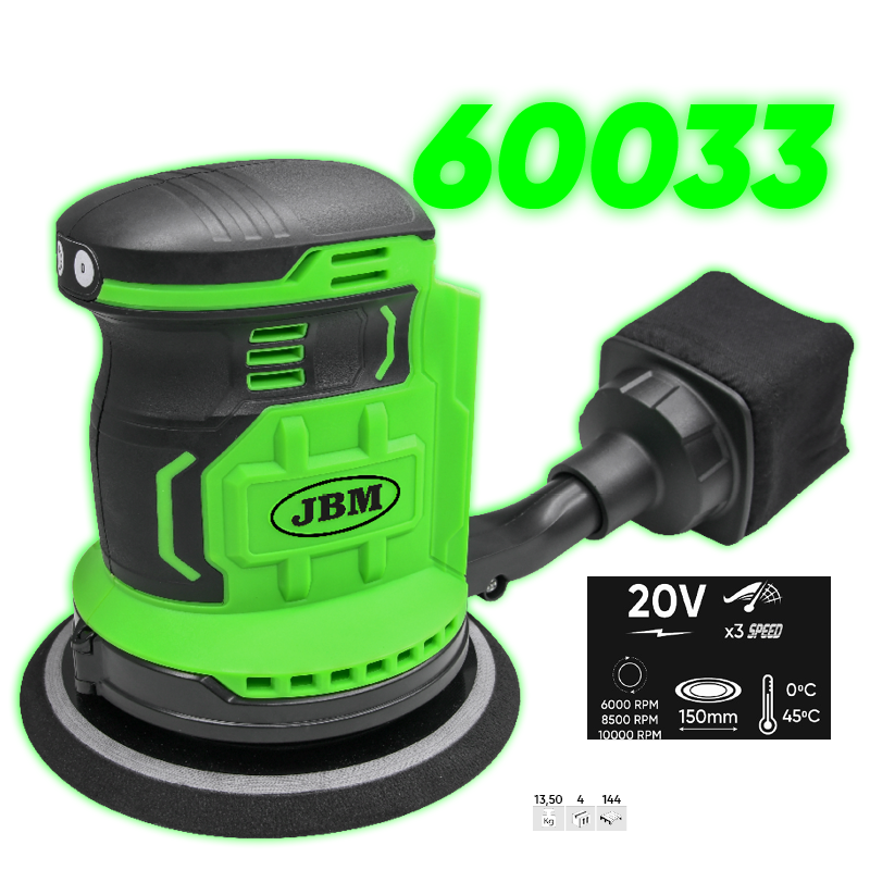 Esta ferramenta foi projetada para lixar madeira, ferro, plástico e materiais semelhantes usando a lixa adequada. Esta lixadeira é ajustável em três velocidades diferentes, tem um punho confortável e um saco de coleta de poeira embutido. Velocidade ociosa: 6000/8000/10000 Diâmetro da base : 150mm Tensão nominal da bateria: 20V Limites das condições ambientais: De 0ºC a 45ºC Capacidade do saco de pó: 0,22L