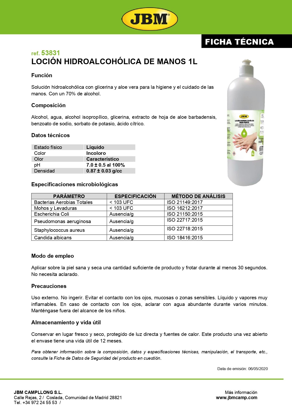 Frasco de loção hidroalcoólica para mãos da marca JBM com rótulo branco, verde e amarelo