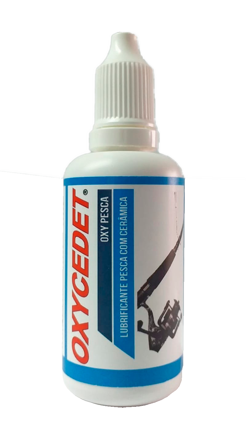 Garrafa de lubrificante para pesca OXYCEDET com rótulo azul e branco