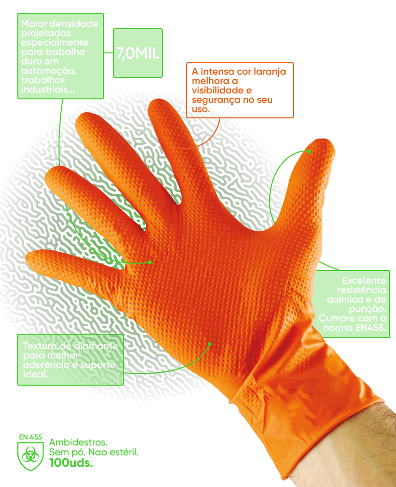 Luvas com textura de diamante para melhor aderência e suporte ideal. Luvas com maior densidade projetadas especialmente para trabalho duro em automoção, trabalhos industriais... A intensa cor laranja melhora a visibilidade e segurança no seu uso. Excelente resistência química e de punção. Cumpre com a norma EN455.