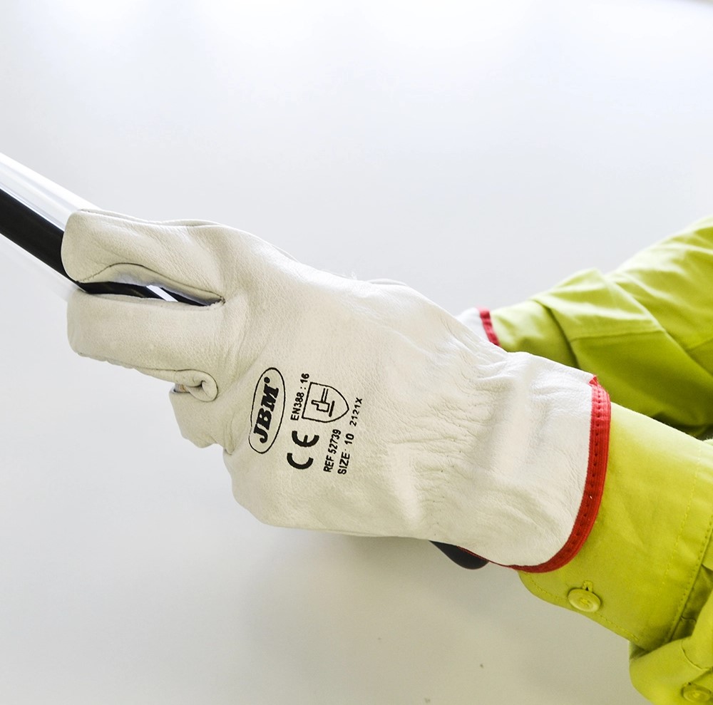 Par de luvas de proteção brancas em couro com detalhes vermelhos e texto impresso
