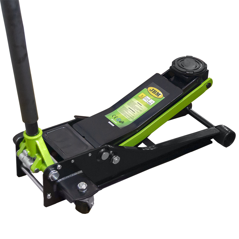 Macaco hidráulico preto e verde com alavanca preta e rodas de nylon