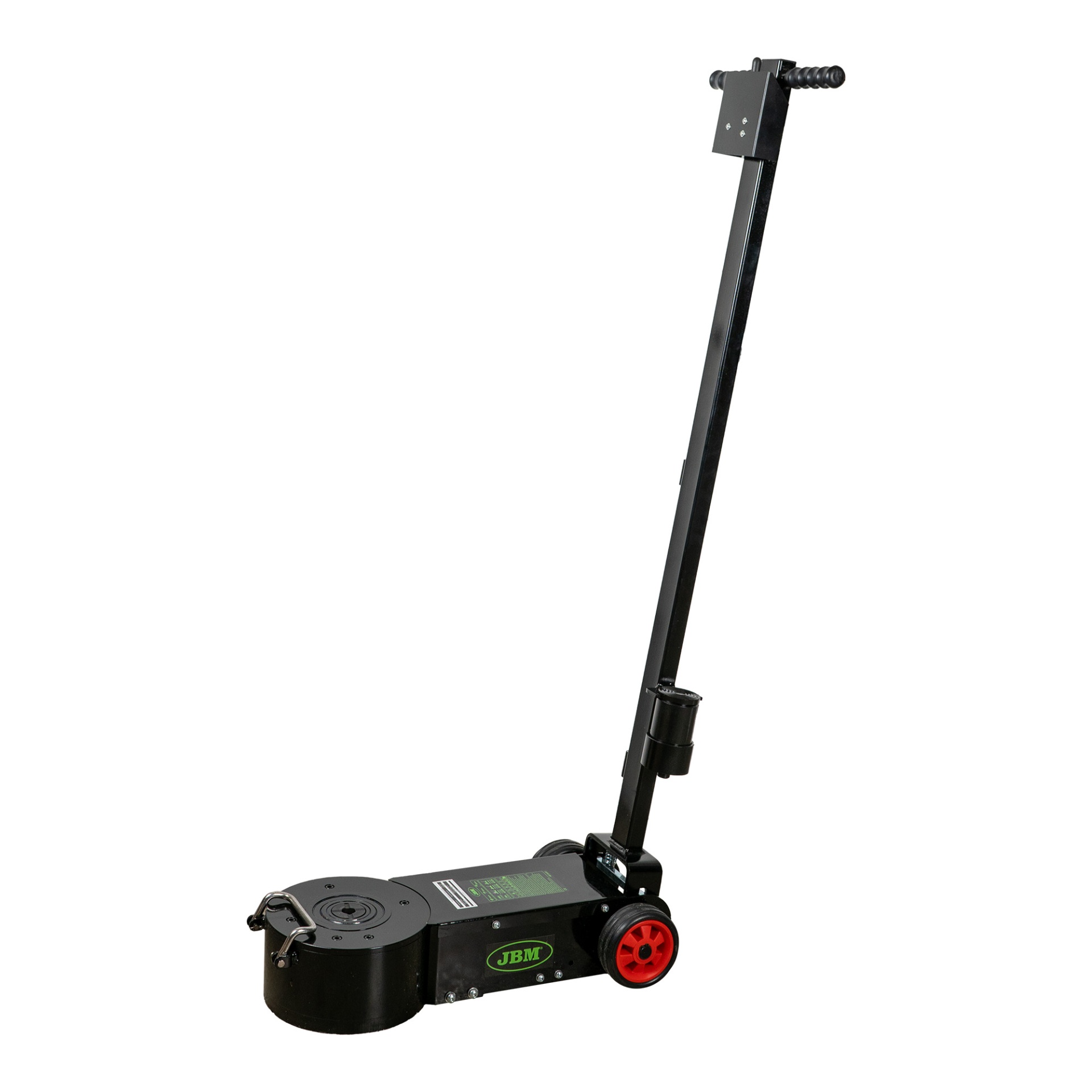 Macaco hidráulico preto com alavanca e rodas vermelhas