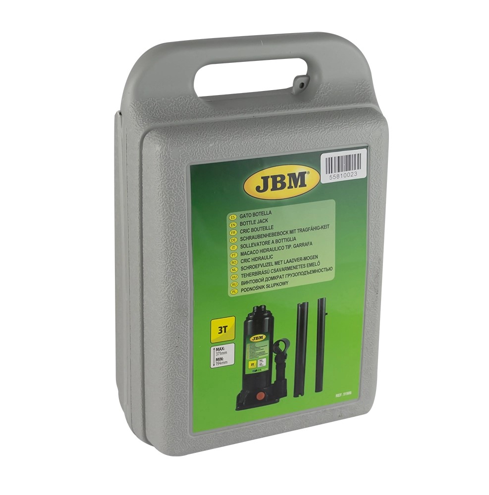 Mala cinza de plástico com macaco hidráulico JBM 2T e etiqueta verde