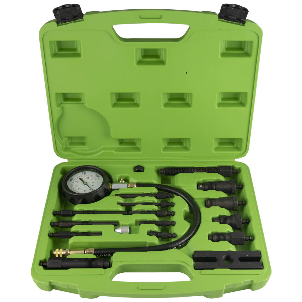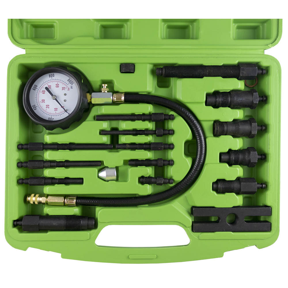 Kit completo para medir a compressão de veículos diesel. Grande variedade de adaptadores para medir na maioría de veículos do mercado.