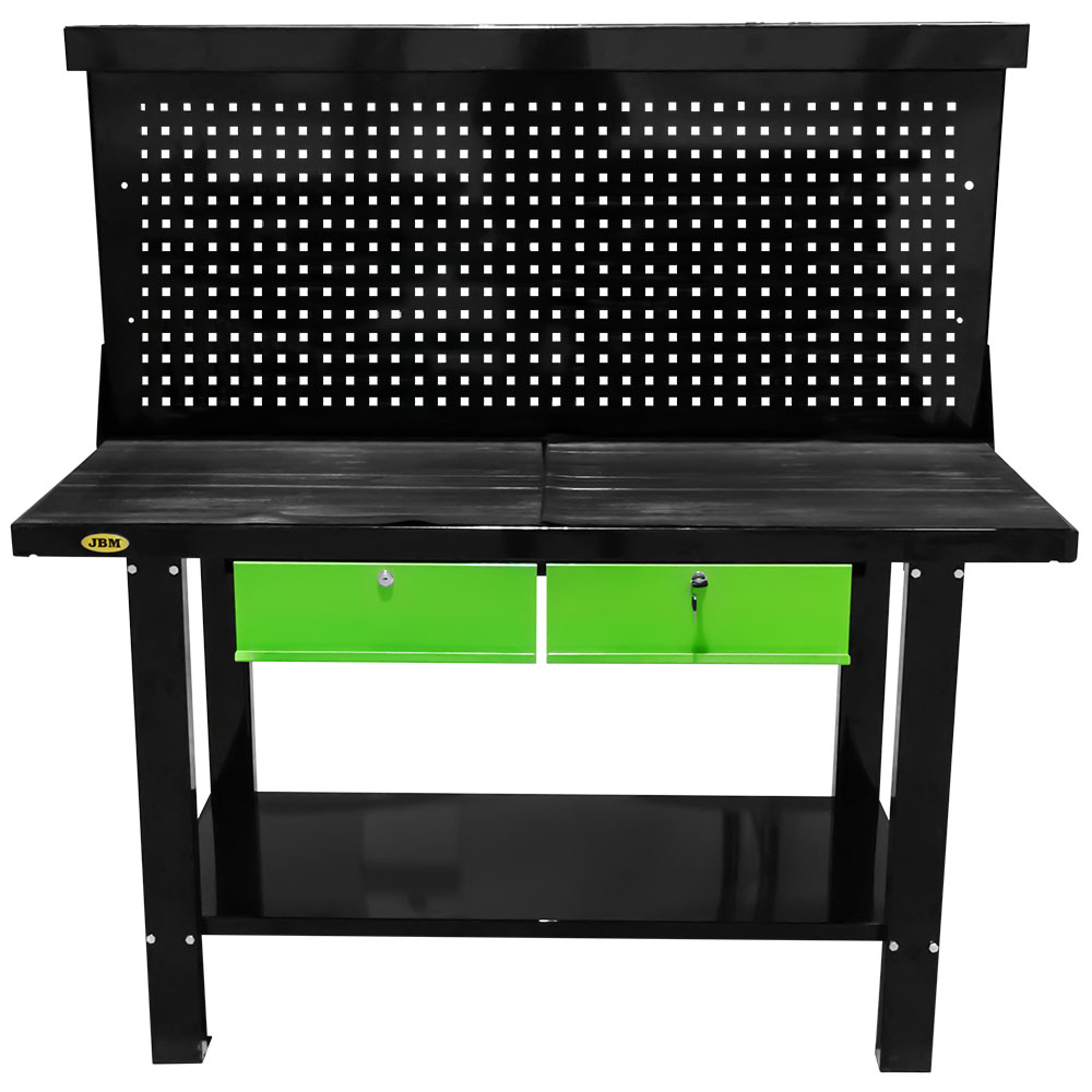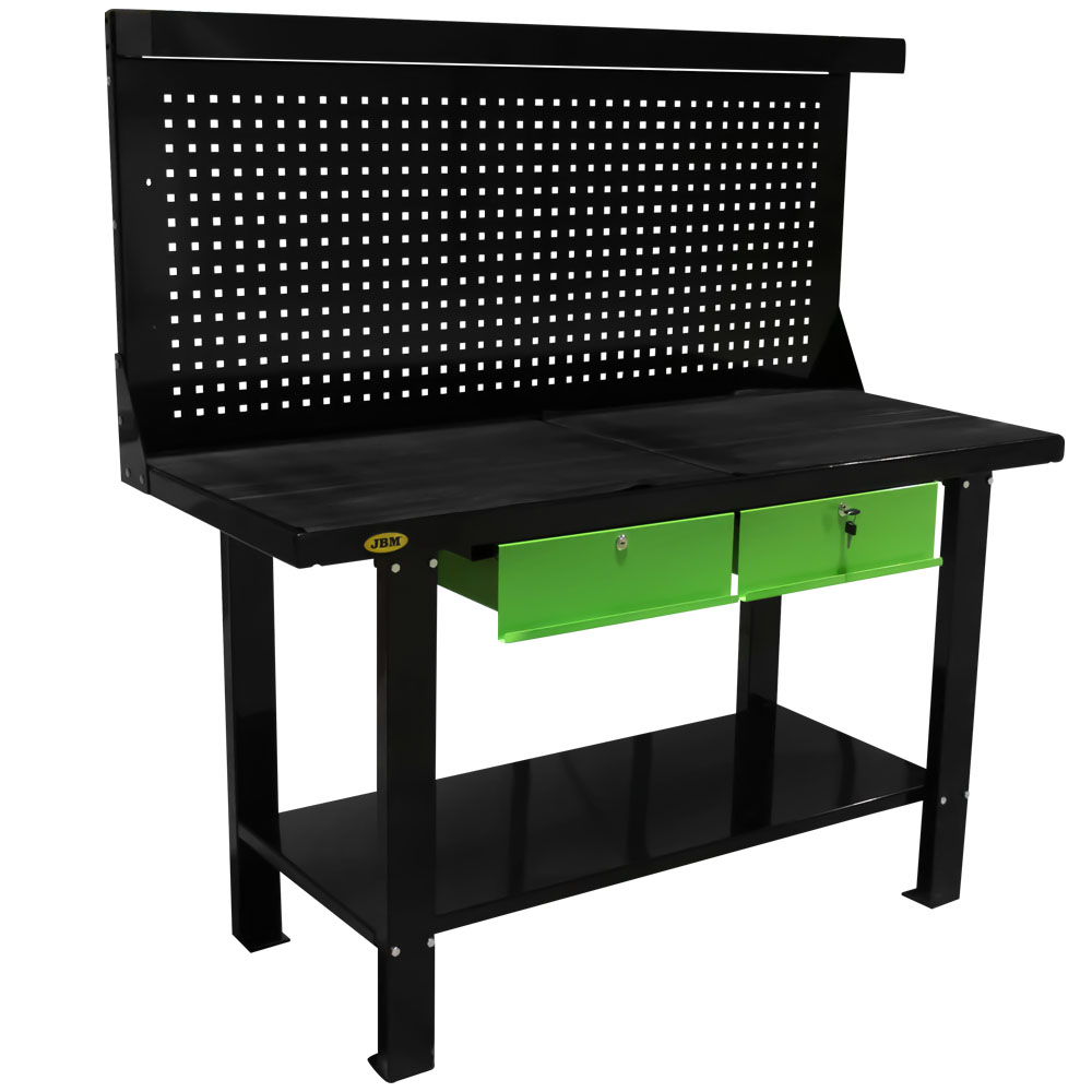 Bancada de trabalho preta com gavetas verdes e painel perfurado