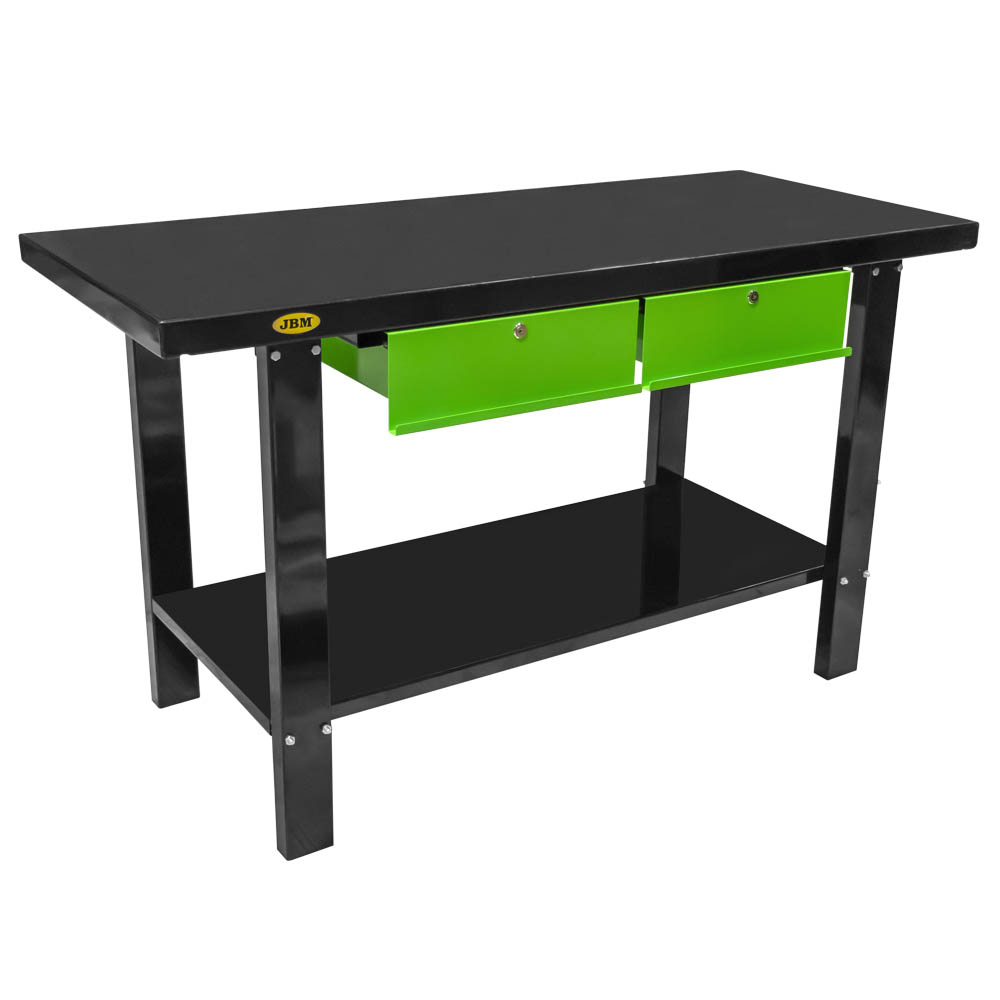 Bancada de trabalho preta com gavetas verdes e estrutura metálica