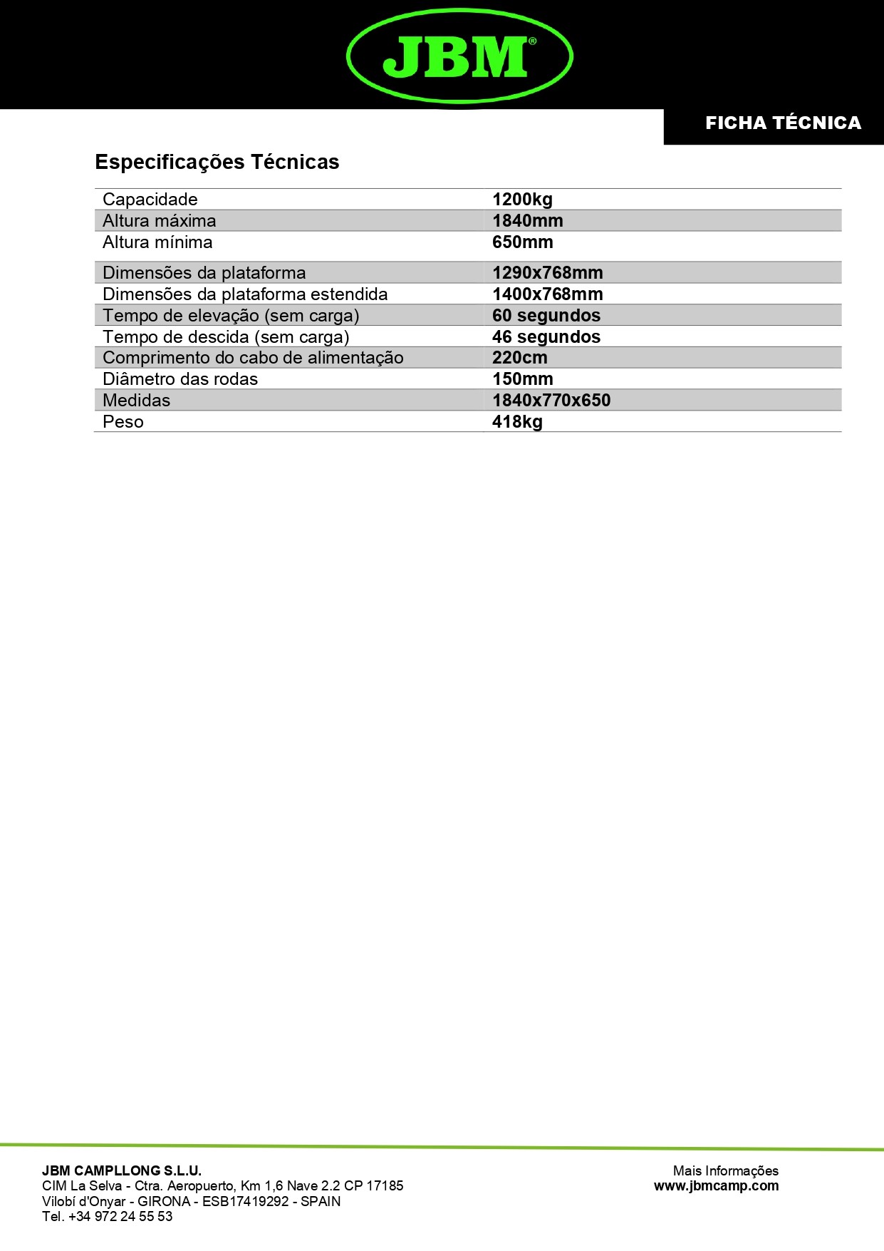 Especificações Técnicas Capacidade 1200kg Altura máxima 1840mm Altura mínima 650mm Dimensões da plataforma 1290x768mm Dimensões da plataforma estendida 1400x768mm Tempo de elevação (sem carga) 60 segundos Tempo de descida (sem carga) 46 segundos Comprimento do cabo de alimentação 220cm Diâmetro das rodas 150mm Medidas 1840x770x650 Peso 418kg