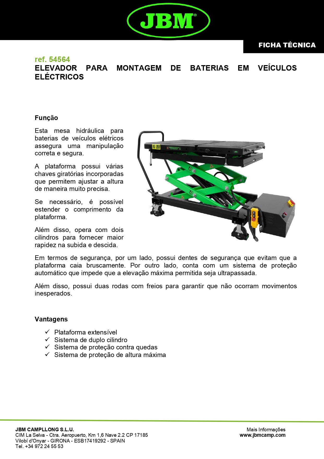Vantagens ✓ Plataforma extensível ✓ Sistema de duplo cilindro ✓ Sistema de proteção contra quedas ✓ Sistema de proteção de altura máxima