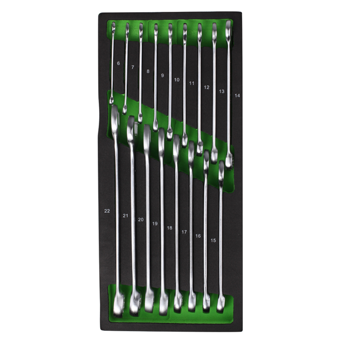 Conjunto de chaves de boca e caixa metálicas em suporte preto e verde