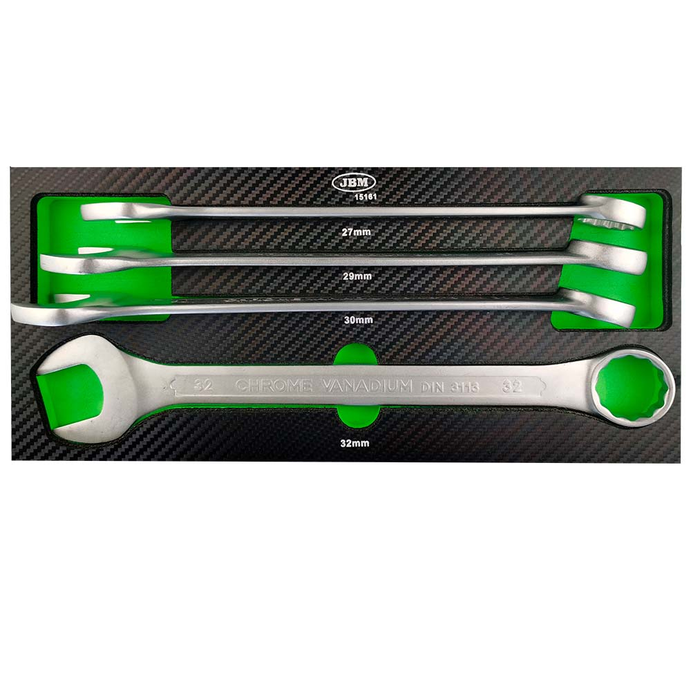 Conjunto de quatro chaves de caixa em aço com tamanhos marcados e base preta com verde