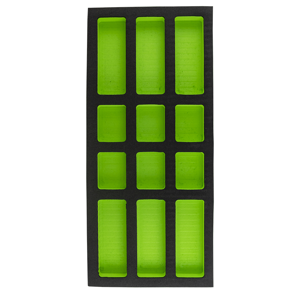 Organizador de espuma preta com compartimentos verdes