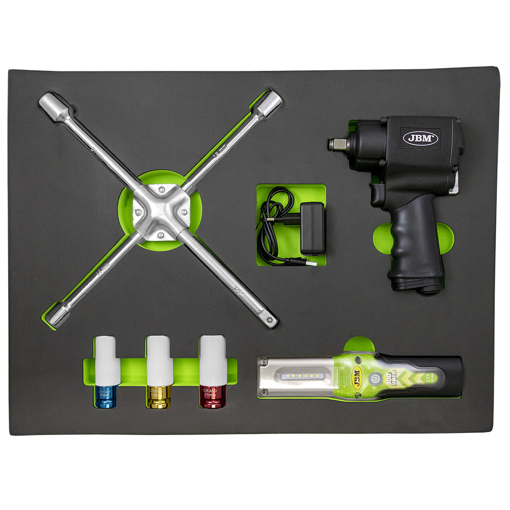 Conjunto de ferramentas com chave cruzada, pistola de impacto, soquetes, carregador e lanterna em estojo preto e verde