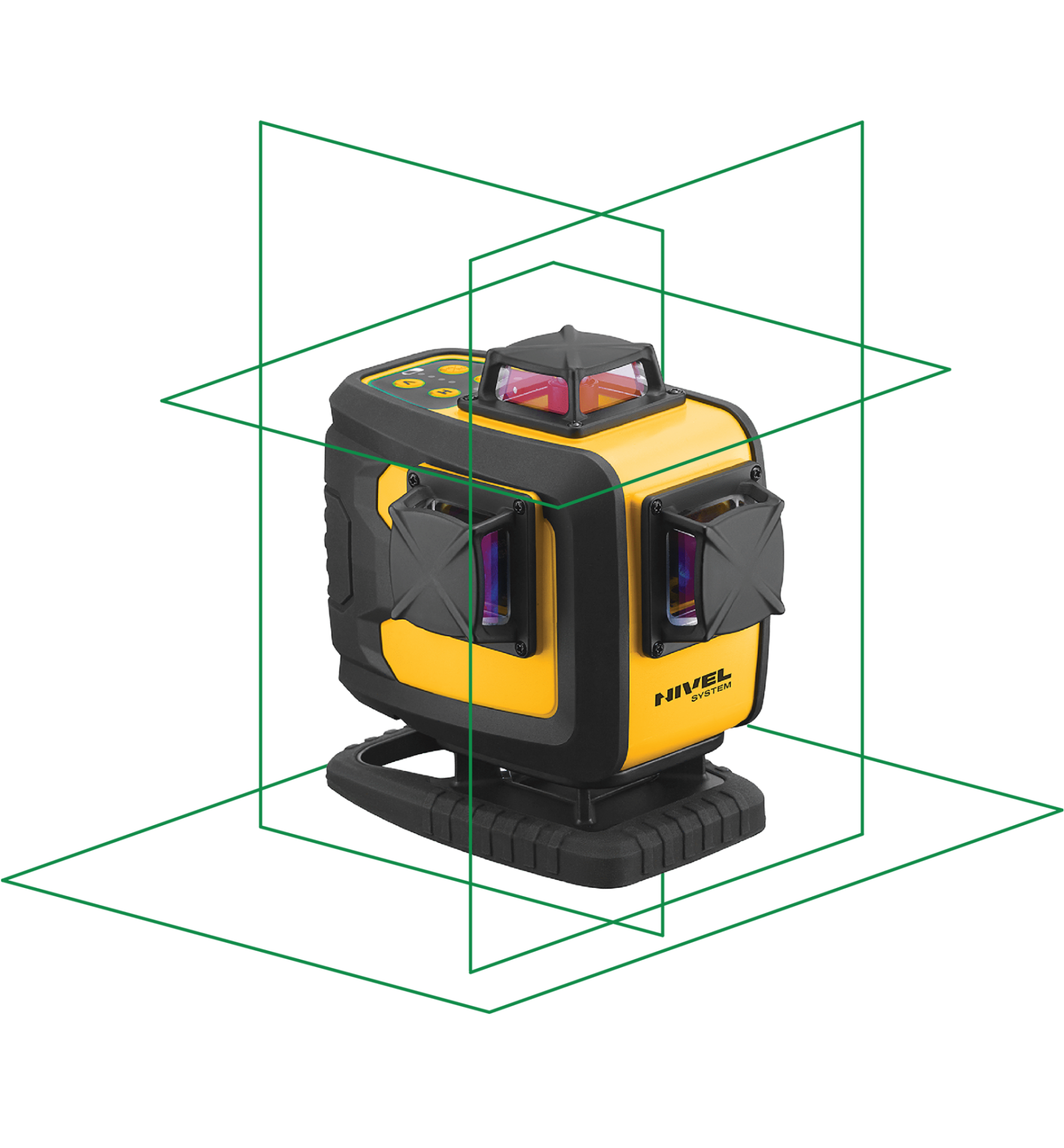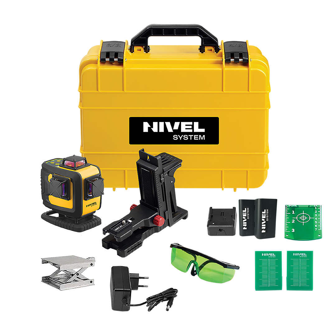 O Nivel System CL4-G – o laser cruzado 4D multifuncional com o soberbo feixe de laser verde. O equipamento apresenta linhas de referência perfeitamente niveladas (horizontal e vertical) nas paredes, que suportam todos os acabamentos e obras gerais. Devido ao fato de o laser possuir 4 cabeças de laser, o usuário pode trabalhar com quatro planos de laser – na faixa de 360° cada. A exibição simultânea contém a configuração de ângulos retos, que está disponível, por exemplo, em obras de construção e acabamento (por exemplo, ladrilhos). A unidade oferece um compensador eletrônico, que é mais eficiente em relação ao magnético. Bloquear o compensador significa que o instrumento pode ser inclinado e pode usar linhas diagonais. A rosca embutida de 1/4″ inclui a estabilidade, bem como a estabilização do instrumento do equipamento montado no tripé, adaptador ou prateleira de laser. O equipamento está muito bem protegido contra poeira e água. A classe de resistência IP54 confirma isso. As cabeças locadoras são protegidas com corpos metálicos e as janelas de vidro possuem um filtro antirreflexo (o feixe de laser não reflete no vidro e não se formam brilhos de laser). Os protetores de borracha nos cantos do corpo do dispositivo eliminam possíveis abrasões, mas também proporcionam uma aderência a laser mais confiável.