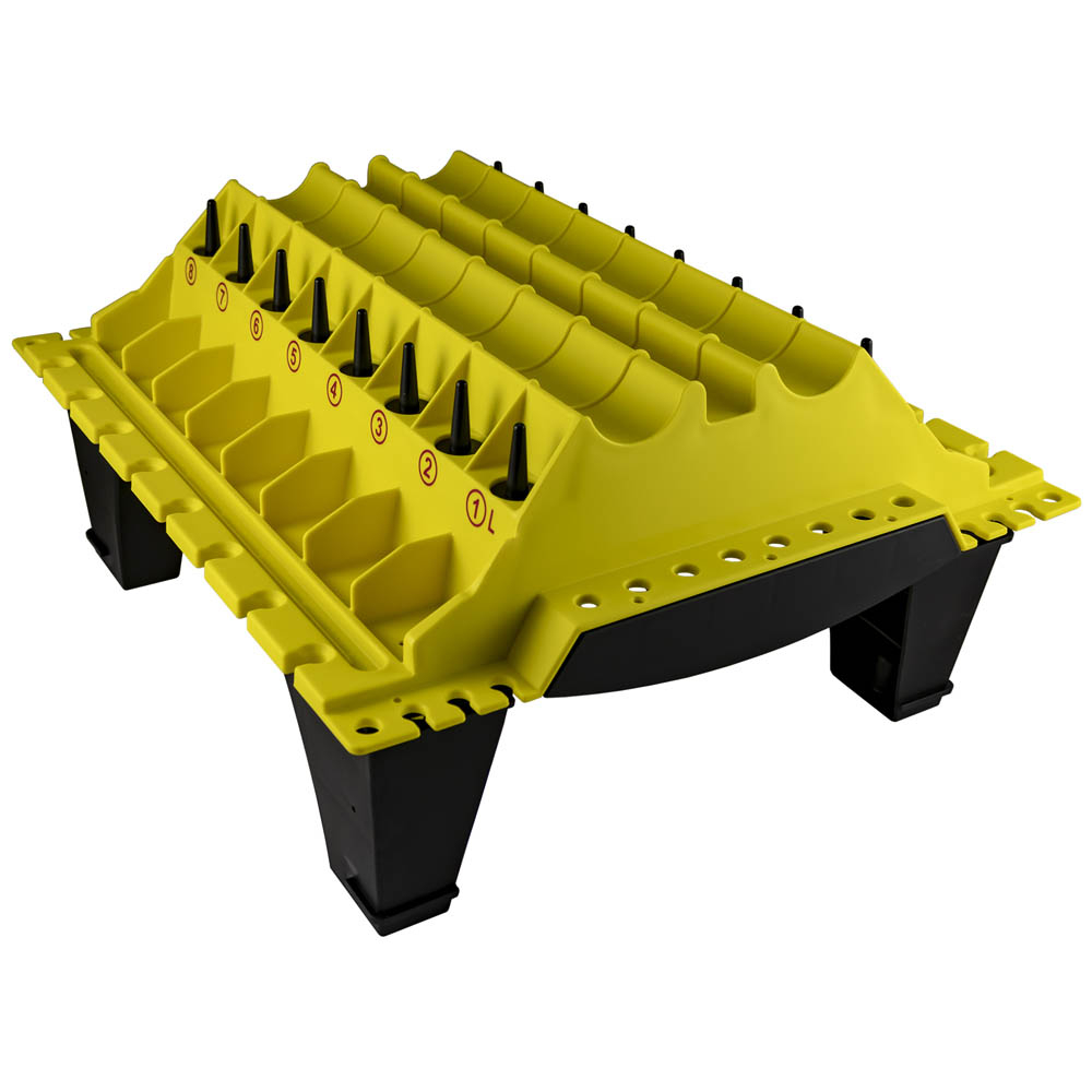 Suporte organizador amarelo e preto com divisórias numeradas e base elevada