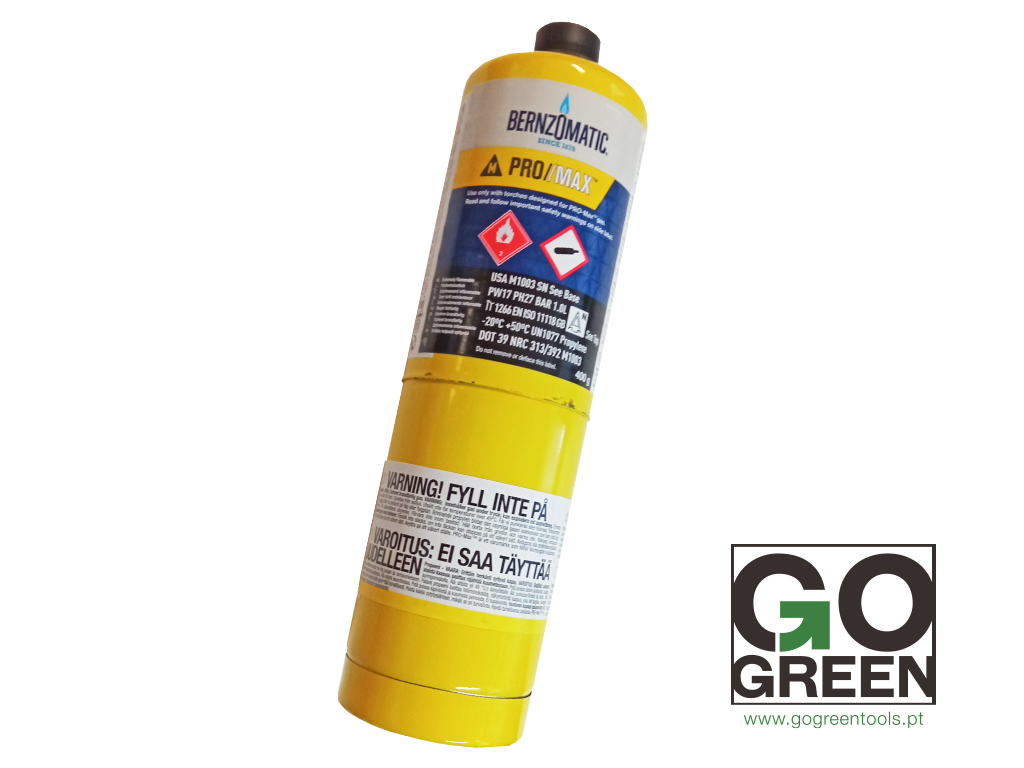 Cilindro amarelo de gás Bernzomatic com rótulos e logo GO GREEN no fundo