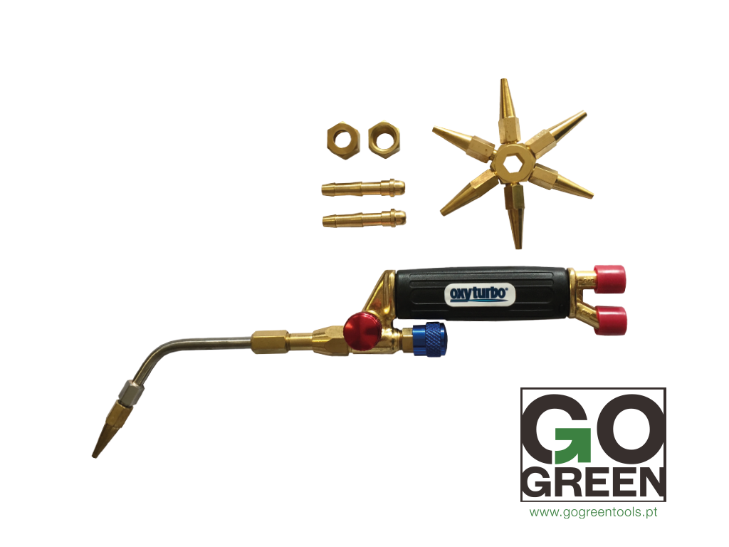 Maçarico Oxyturbo com acessórios metálicos dourados e logótipo GO GREEN