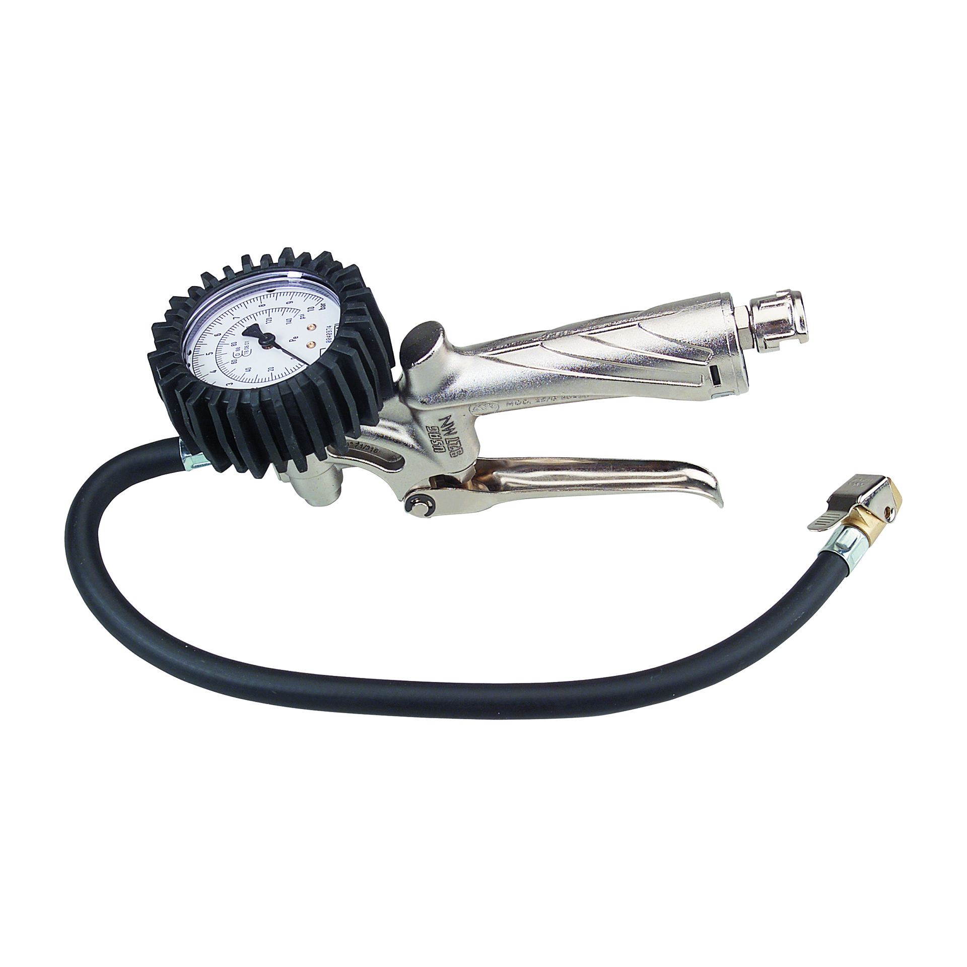 Medidor de pressão de pneus metálico com manómetro e mangueira preta