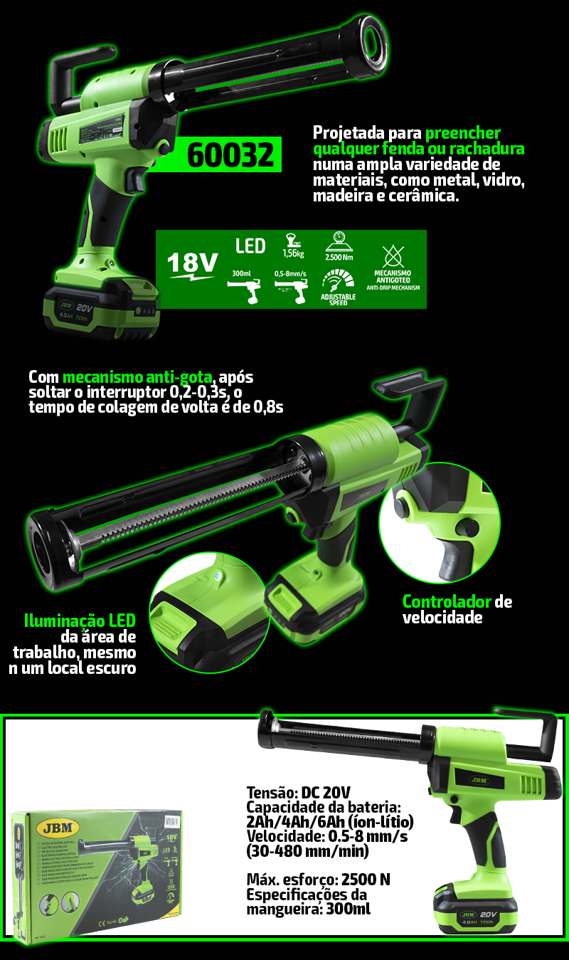 Tensão: DC-20V Capacidade da bateria: 2Ah / 4Ah / 6Ah (íon-lítio) Velocidade de impulso: 0,5-8 mm / s (30-480 mm / min) Força de impulso máxima: 2500 N Capacidade do cartucho: 300ml Peso: 1,56 kg